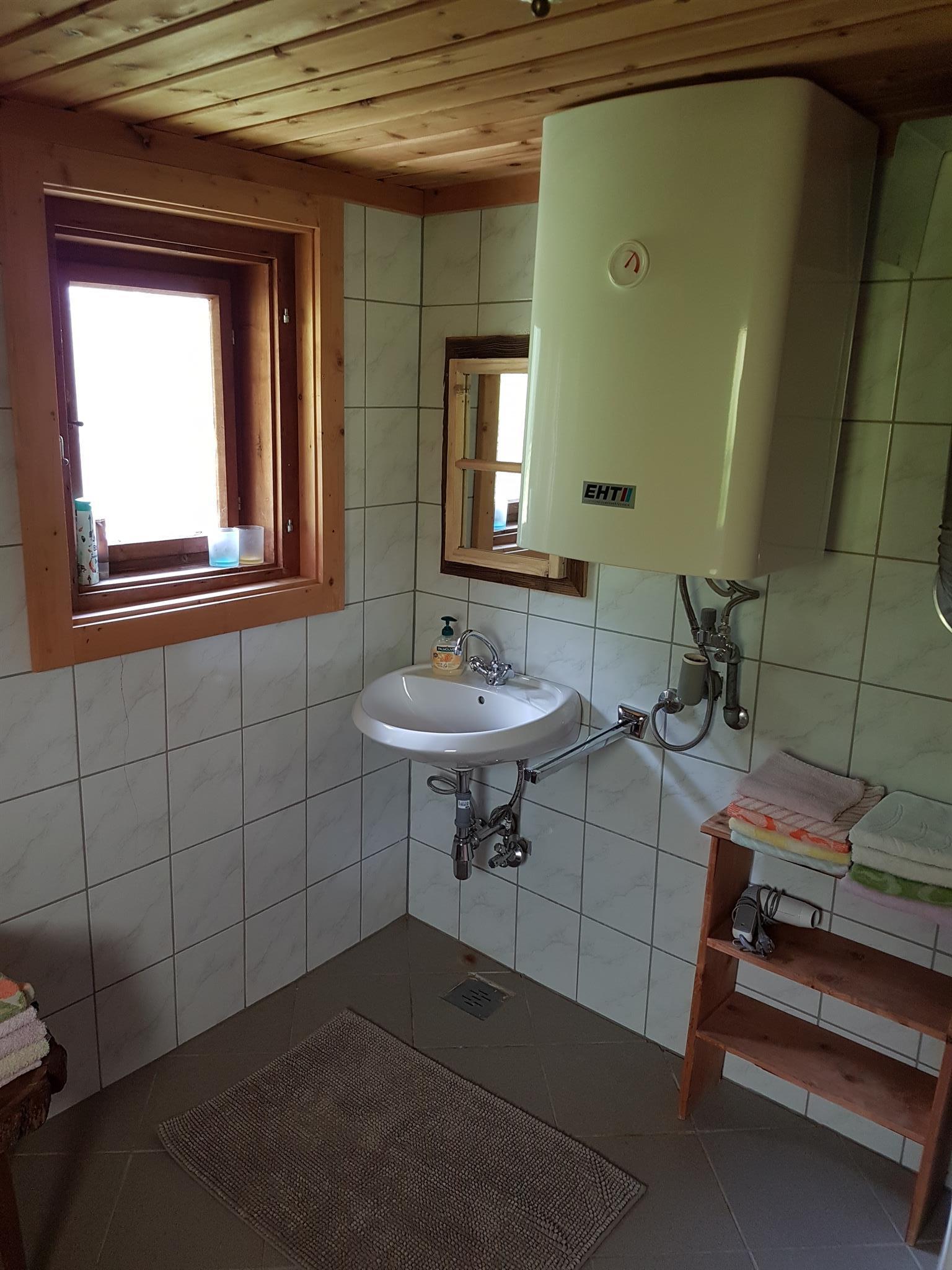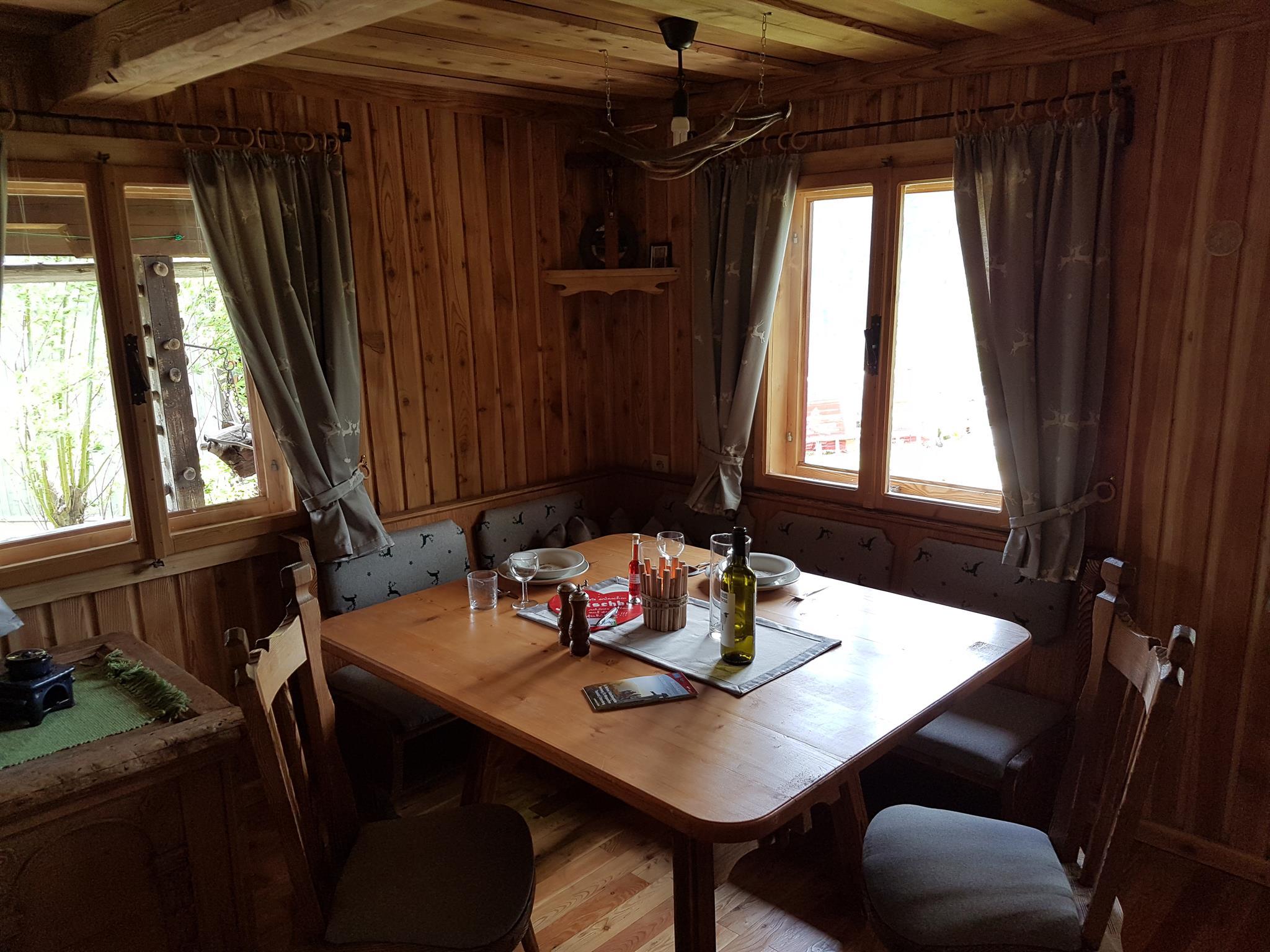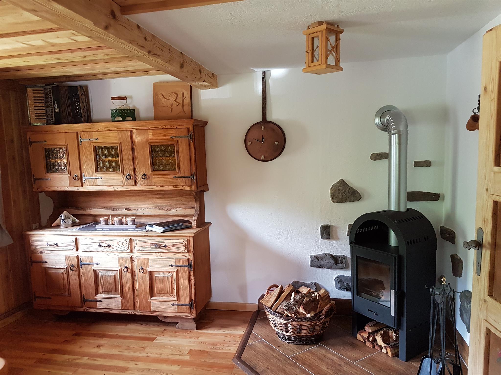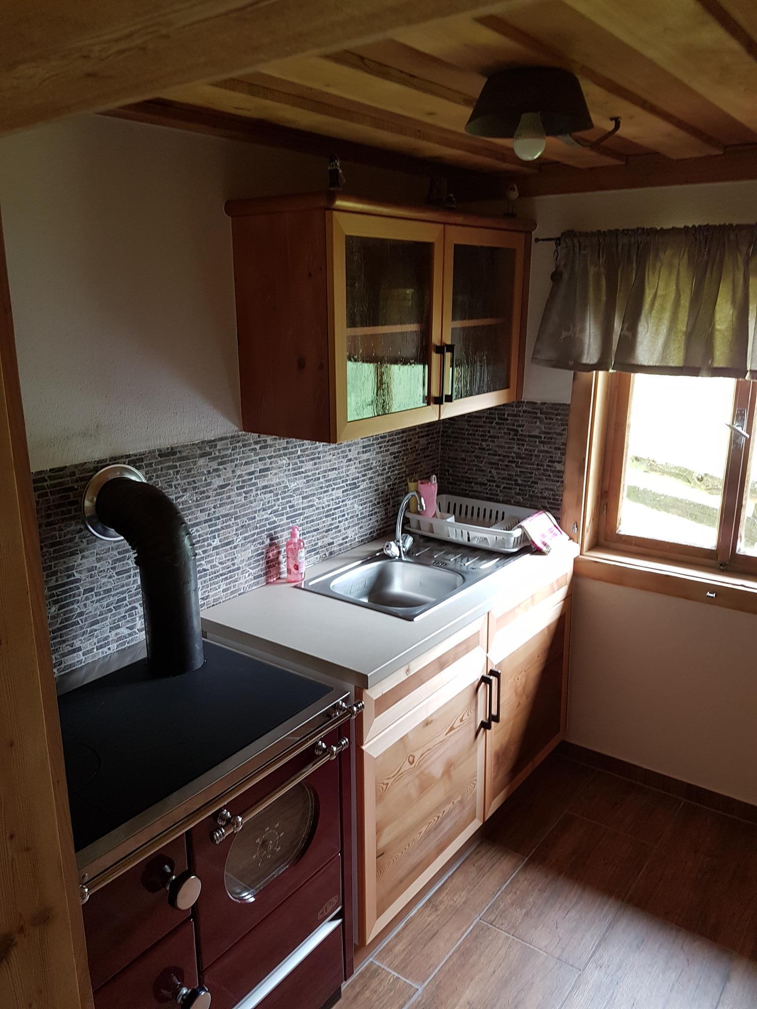 Essraum mit Couch und Essecke, Strom, kalt warm Wasser, Holzherd in der Küche und im Wohnbereich. Badezimmer mit Dusche, WC und Waschbecken.