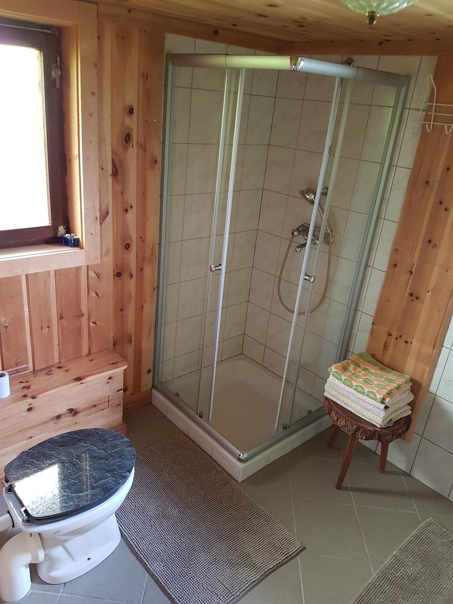 Essraum mit Couch, Holzherd und Essecke. Badezimmer mit Dusche, Waschbecken und WC.