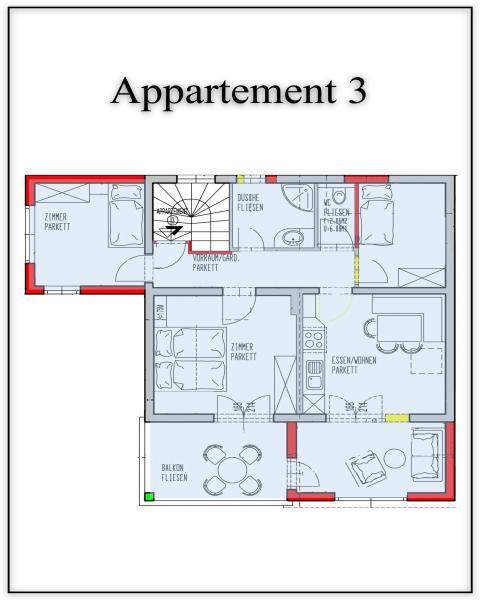 Das Appartement besteht aus einem Schlafzimmer mit Doppelbett, 2 Schlafzimmer mit 2 Einzelbetten,Wohnküche mit ausziehbarer Couch für 2 Pers. Dusche, WC separat, Balkon.