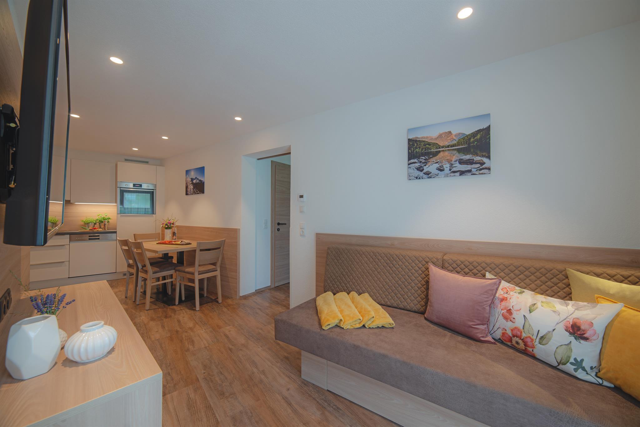 Unser NEUES und MODERNES Appartement mit ca. 65 m² befindet sich im Erdgeschoss mit direktem Zugang zur großen, möblierten Sonnenterrasse und bietet Ihnen: 2 komfortable Doppelzimmer mit je einem modernen Badezimmer mit Dusche/WC; 1 voll ausgestattete Wohnküche (Elektroherd, Backrohr, Wasserkocher, Kaffeemaschine, Toaster uvm.) mit gemütlichem Essbereich und großem Sofa (Schlafsofa für 1 weitere Personen). Genießen Sie die Ötztaler Bergluft und den herrlichen Ausblick auf Ihrer Urlaubsterrasse.