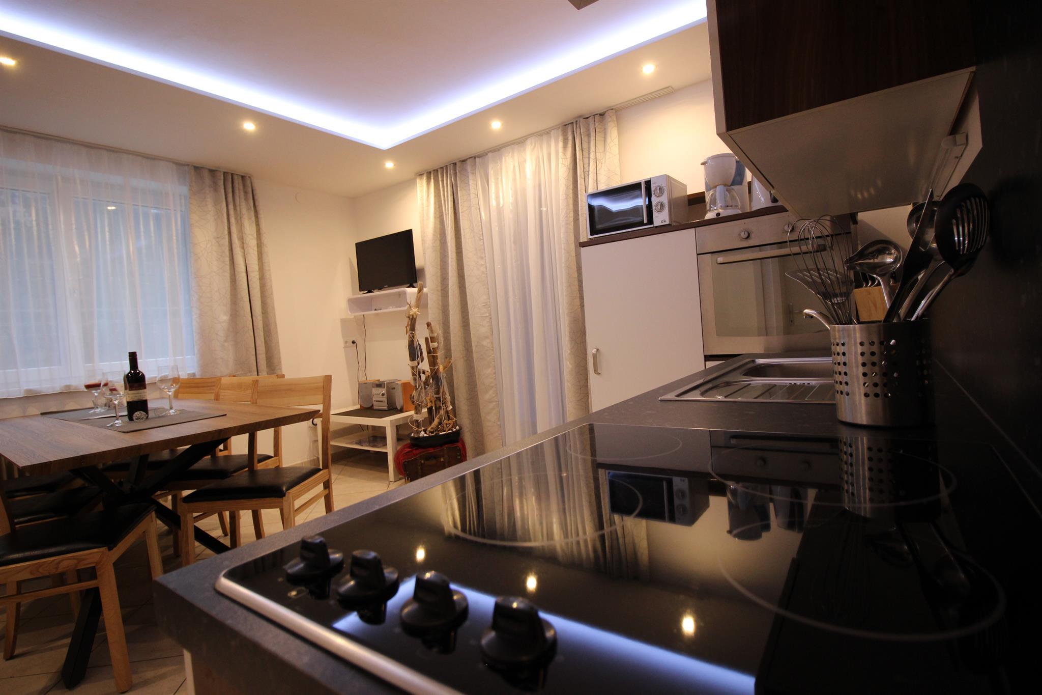 E-Herd mit Ceranfeld/Backrohr, Kühlschrank/Gefrierfach, Kaffeemaschine, Wasserkocher, Toaster, Mikrowelle, Geschirr/Gläser/Besteck, Bettwäsche, Hand und Badetücher mit Fön