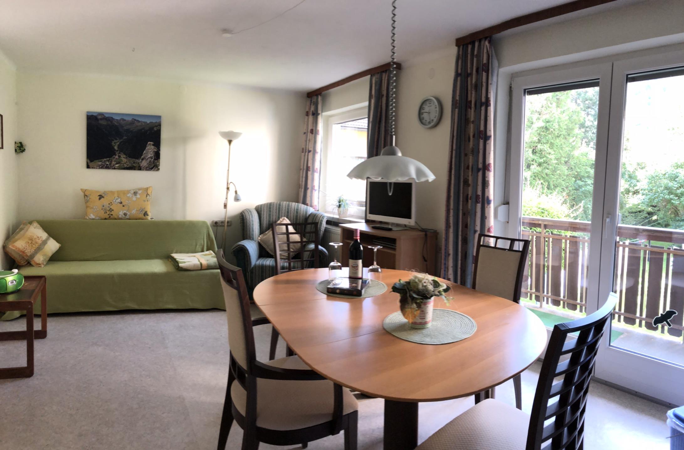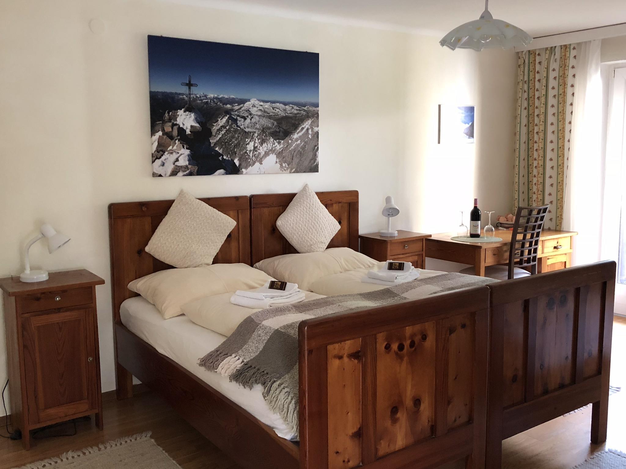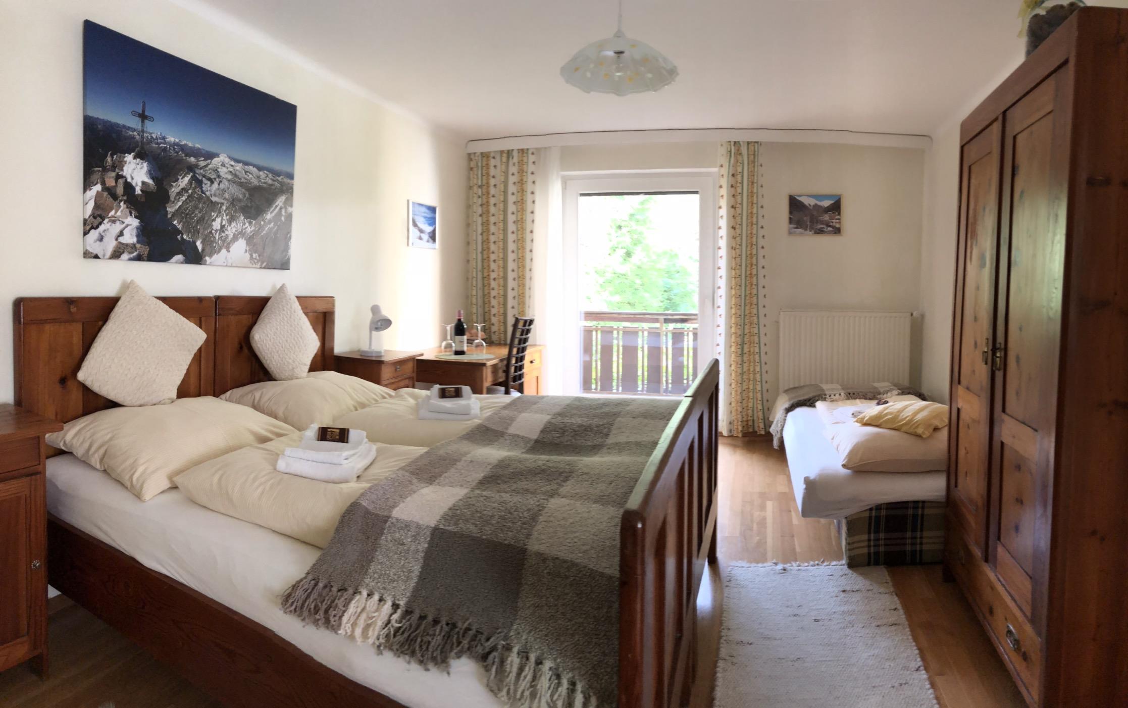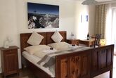 Appartement Enzian : Ein geräumiges Schlafzimmer mit Doppelbett und Coach, Duschbad und großer Wohnküche mit Ceranherd, Backofen, Mikrowelle, Toaster, Kaffeemaschine, W-lan und Kabel-TV. Jedes Zimmer hat einen eigenen Balkon mit Aussicht auf die Berge