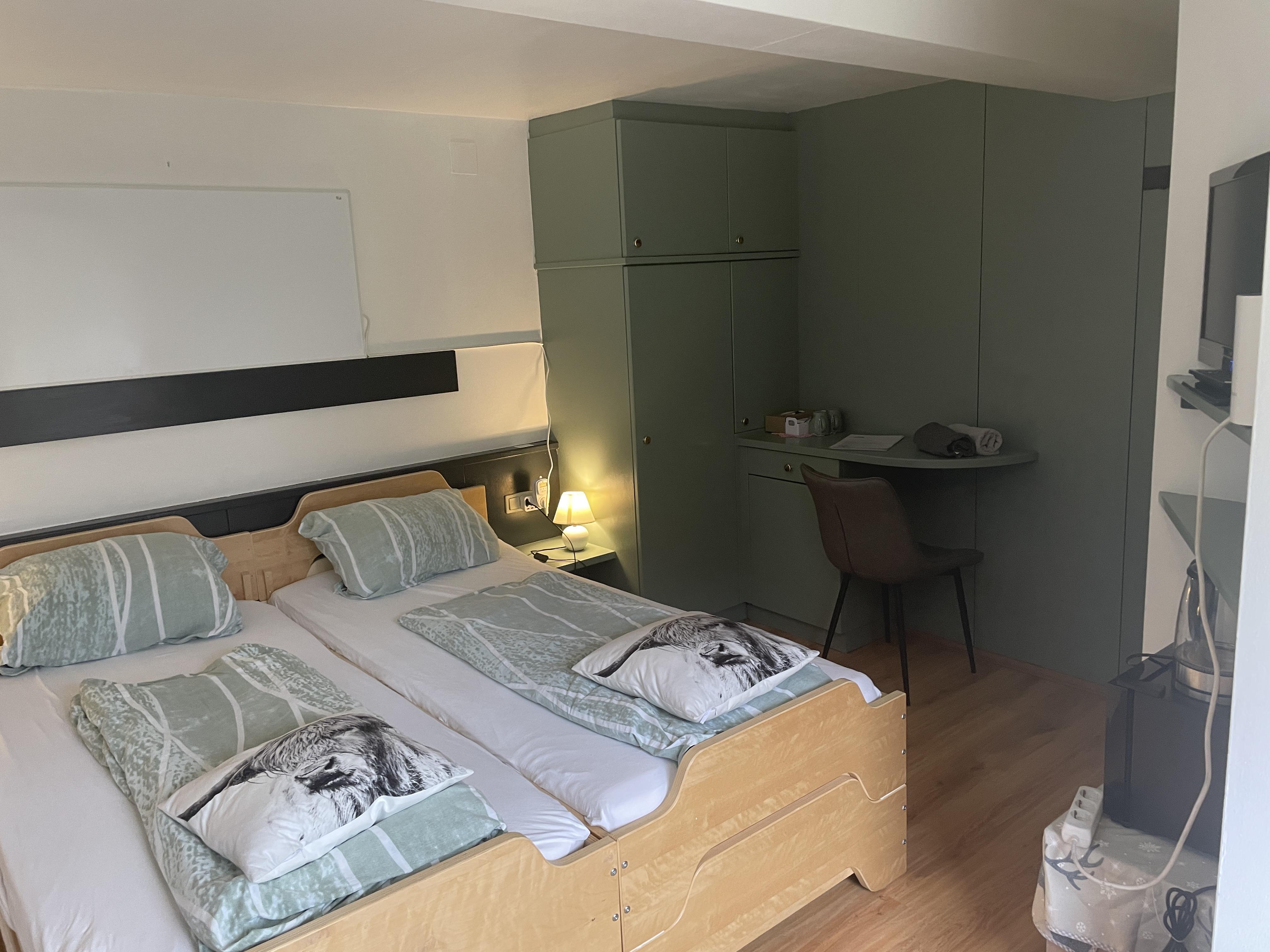 Das Doppelzimmer Kreuzeck befindet sich im 2. Obergeschoss und bietet eine komfortable und ruhige Unterkunft für zwei Personen. Die Zimmerausstattung umfasst einen Kleiderschrank für dein Gepäck, eine Sitzecke zum Entspannen sowie einen Wasserkocher mit Kaffee- und Teezubehör für zusätzlichen Komfort während deines Aufenthalts.