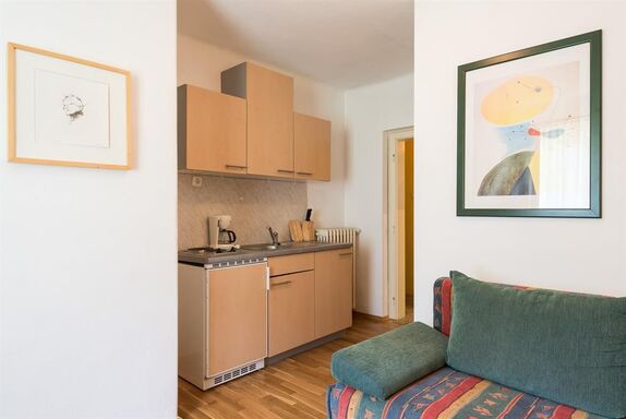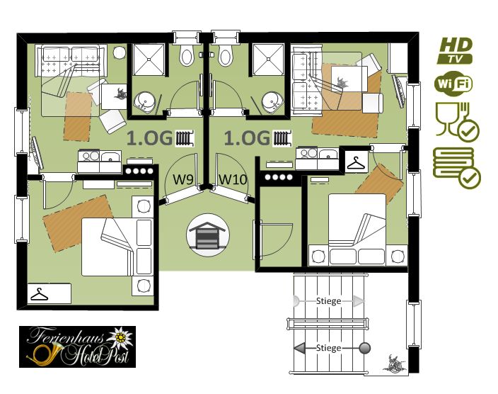 1. OG, Vorraum, Wohnzimmer mit Kochnische, Schlafzimmer, DU/WC - max 3 Pers. Die Wohnung ist für 2 Personen. Der Wohnbereich kann aber auch zum Schlafraum für 1 bis 2 Personen umfunktioniert werden. Die beiden Wohnungen W9 und W10 sind unmittelbar nebeneinander und gemeinsam ideal für Familien mit älteren Kindern. Da kann man ungestört den Urlaub genießen.
