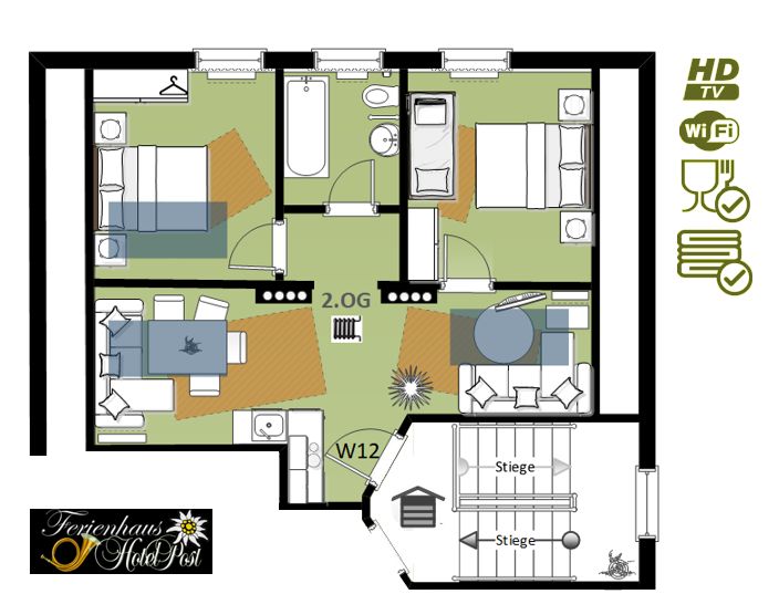 Die Wohnung W12 ist im 2. Obergeschoß und besteht aus Küche und Wohnbereich, 2 getrennte Schlafzimmer, Bad/WC - max 4(+1Kind) Personen.