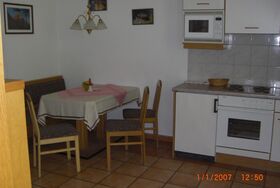 Küche mit gemütlicher Essecke, Raumteiler zur Wohnecke mit ausziehbarer Couch, Schlafzimmer mit Liegesofa, Dusche, Wc extra, großer Südbalkon