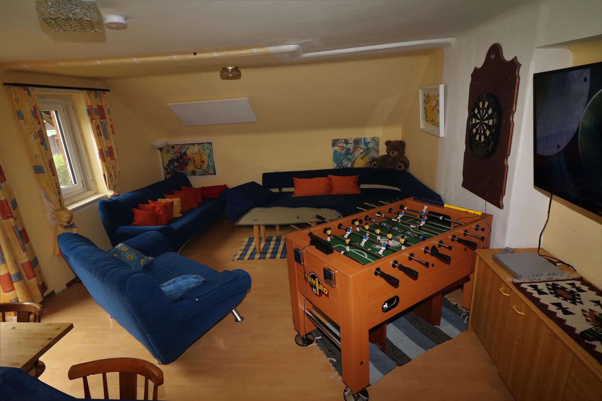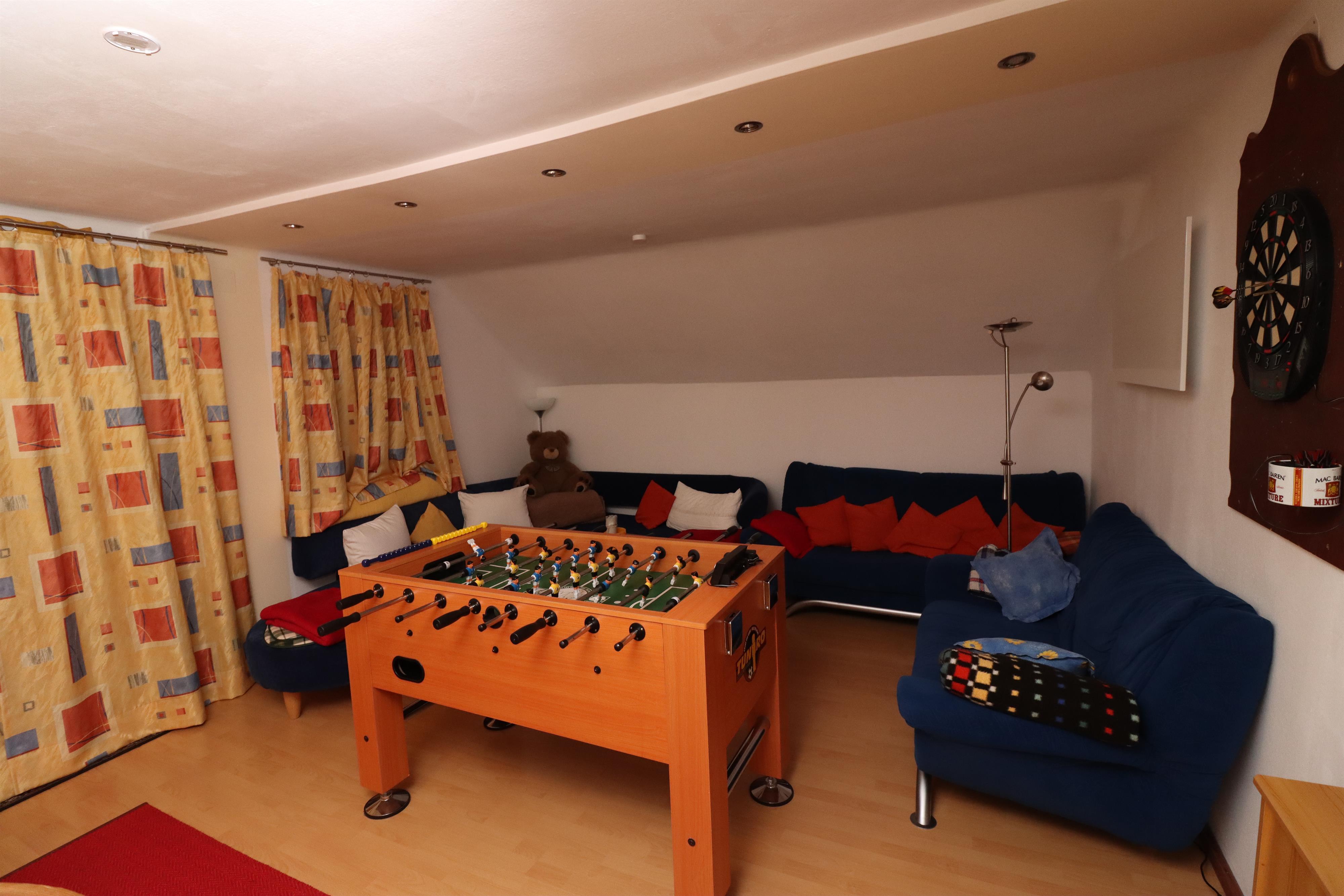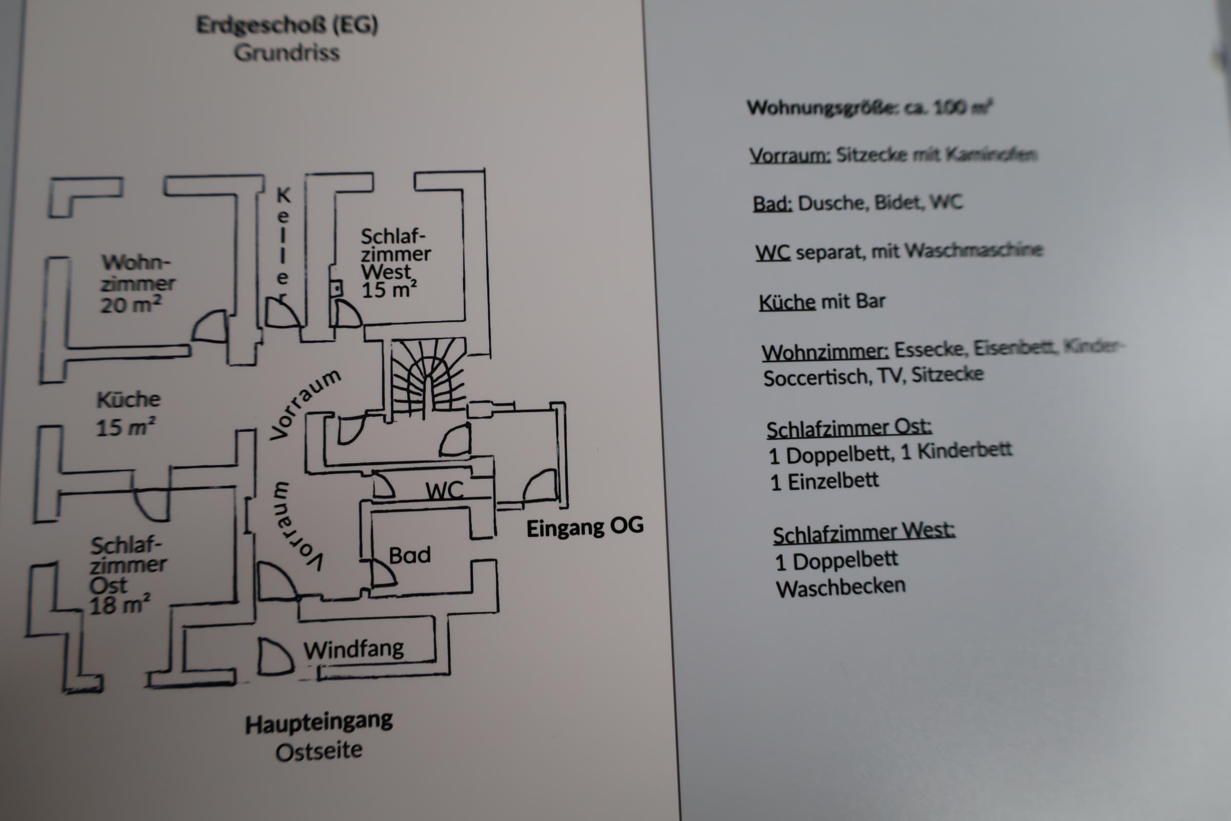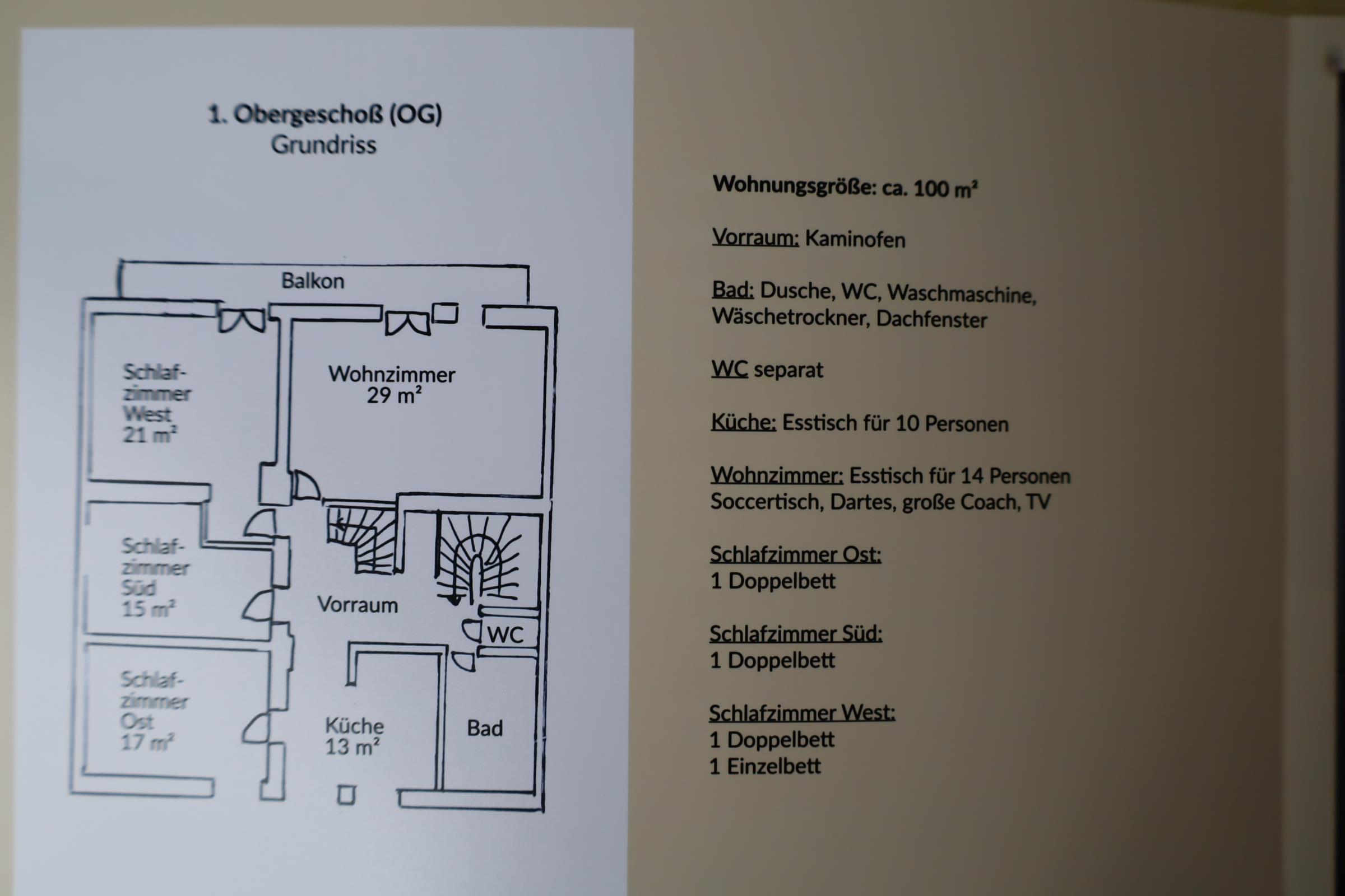 1. Obergeschoß: 100 qm, 3 Zimmer, Spiele-/Wohnzimmer, Küche (Mikrowelle, Geschirrspüler), Bad (Dusche, WC), WC, Kaminofen, SAT-TV, CD/DVD, Soccer-Tisch, WLAN