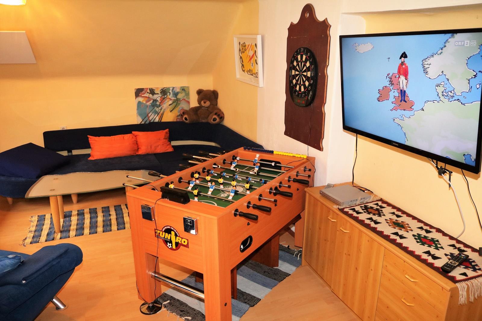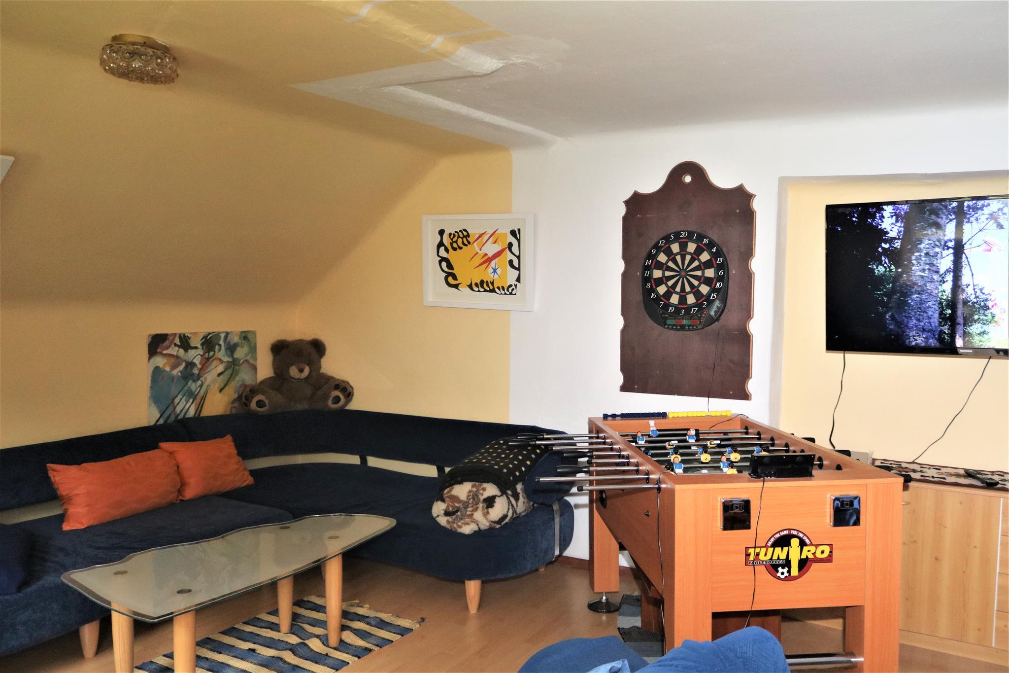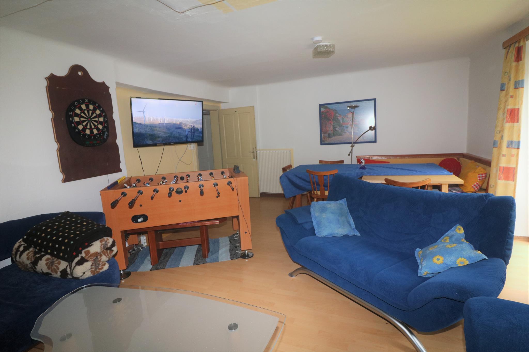 1. Obergeschoß: 100 qm, 3 Zimmer, Spiele-/Wohnzimmer, Küche (Mikrowelle, Geschirrspüler), Bad (Dusche, WC), WC, Kaminofen, SAT-TV, CD/DVD, Soccer-Tisch, WLAN