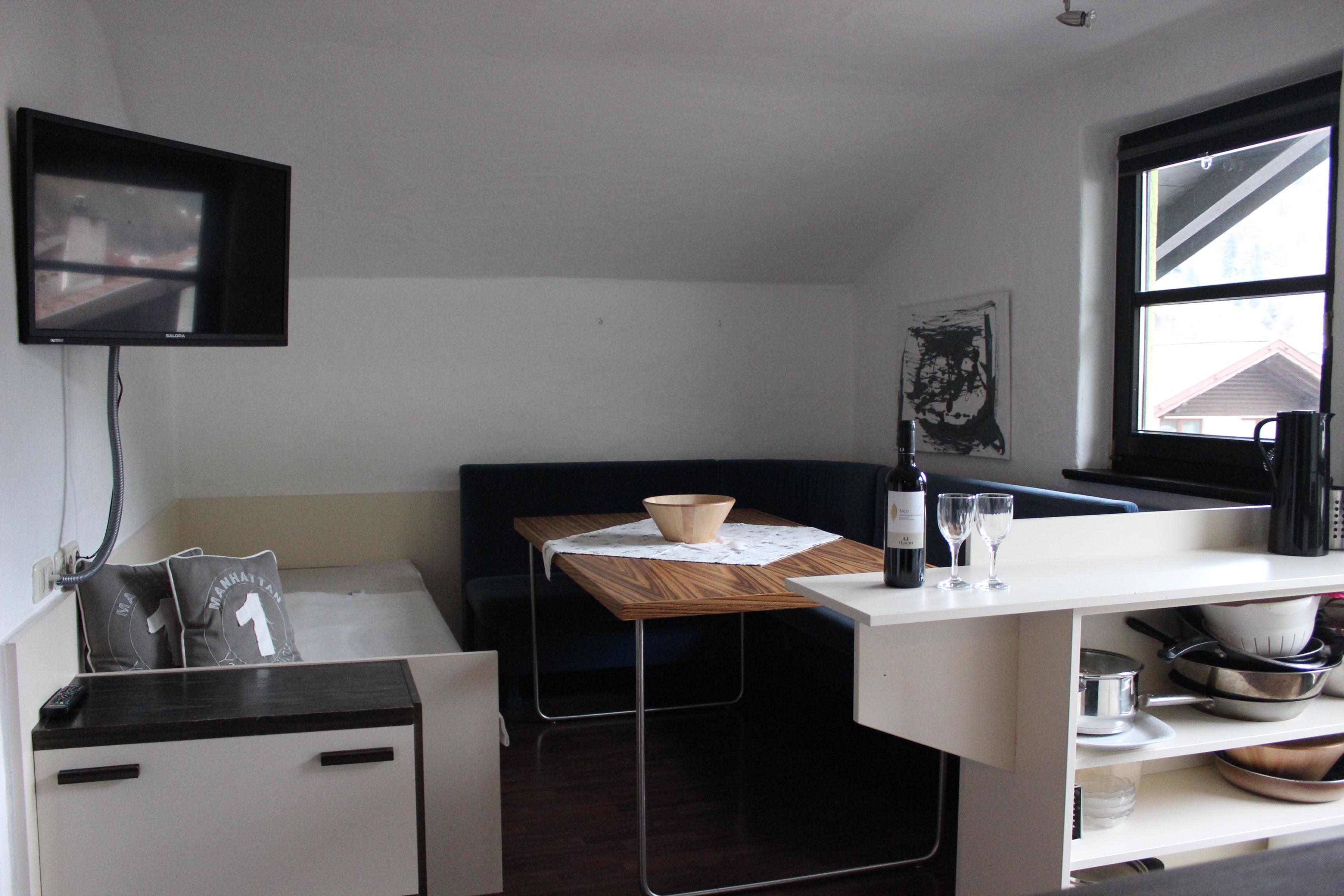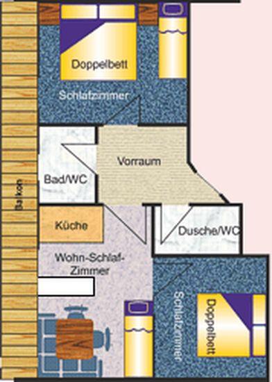 Appartement im 3. Stock mit 1 Doppel- und 1 Dreibettzimmer; 1 Wohnschlafraum mit einem Zusatzbett, Küchenblock mit Backofen und 4-Plattenherd, Kühlschrank, Kaffeemaschine, Geschirrspüler uvm.; Kabel-TV, 2 Badezimmer - eines mit Badewanne/WC und eines mit Dusche/C; Balkon. Größe: ca. 50 m².