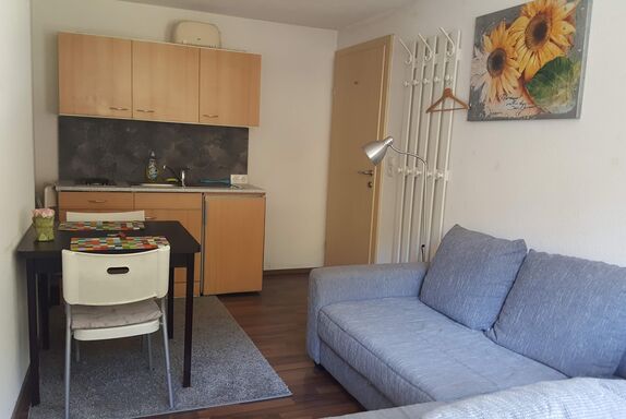 Appartement mit ca. 30 m²: 1 Doppelzimmer; 1 Badezimmer mit Dusche/WC; 1 Wohn-Schlafraum mit Schlafsofa, Kochzeile, Esstisch, Kühlschrank, Elektroherd, Kaffeemaschine, Toaster uvm. Balkon zum Sonnetanken.