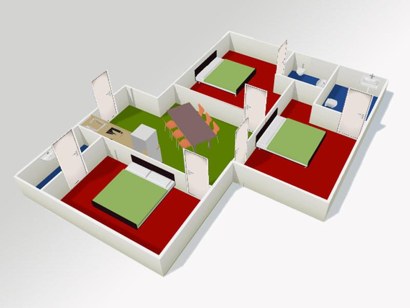 Freundliches und helles Appartement (70 m²) mit sehr großem Balkon, 3 getrennten Schlafzimmer und 3 getrennten Badezimmer mit DU/WC. Gut ausgestattete Wohnküche mit Digital-TV, Radio, freier Internetzugang (W-Lan), Kombi-Mikrowelle, Geschirrspüler und Elektroherd.