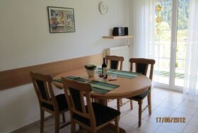 Modernes Appartement (60m²) mit 2 getrennten Schlafzimmern (1 Doppelbett, 2 Einzelbetten + Ausziehcouch für 1 Person) mit einem Flachbild-SAT-TV und ein Badezimmer mit Dusche und Badewanne/WC (Föhn vorhanden) sowie einem separaten WC. Gemütliche Küche mit voll ausgestatteter Küchenzeile (Spülmaschine, E-Herd mit Backofen, Mikrowelle, Kaffeemaschine, Wasserkocher, Toaster, Handmixer und Kühlschrank mit Gefrierfach) und Esstisch. Vorraum, sowie möblierter Balkon mit Bergblick. Handtücher, Bett- und Tischwäsche werden kostenlos zur Verfügung gestellt. WLAN frei verfügbar.