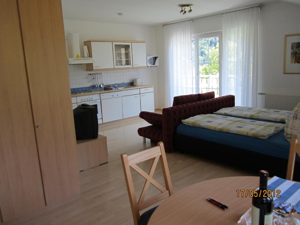 Modernes Appartement (40m²): Studio mit Küchenzeile, Badezimmer und Vorzimmer. 1 Doppelbett, 1 Schlafcouch sowie Badezimmer mit Dusche/WC (Föhn vorhanden). Voll ausgestattete Küchenzeile (Spülmaschine, E-Herd mit Backofen, Mikrowelle, Kaffeemaschine, Wasserkocher, Toaster, Handmixer und Kühlschrank mit Gefrierfach) und Esstisch mit einem Flachbild-SAT-TV. Möblierter Balkon mit Bergblick. Handtücher, Bett- und Tischwäsche werden kostenlos zur Verfügung gestellt. WLAN frei verfügbar.