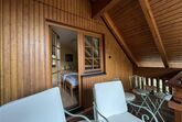 Das Zweibettzimmer Johann und das Doppelzimmer Maria sind beide in der ersten Etage mit Zugang zum großen überdachten Eckbalkon, gemütlich ausgestattet mit Vintage Sitzgruppe und Schaukelstühlen.