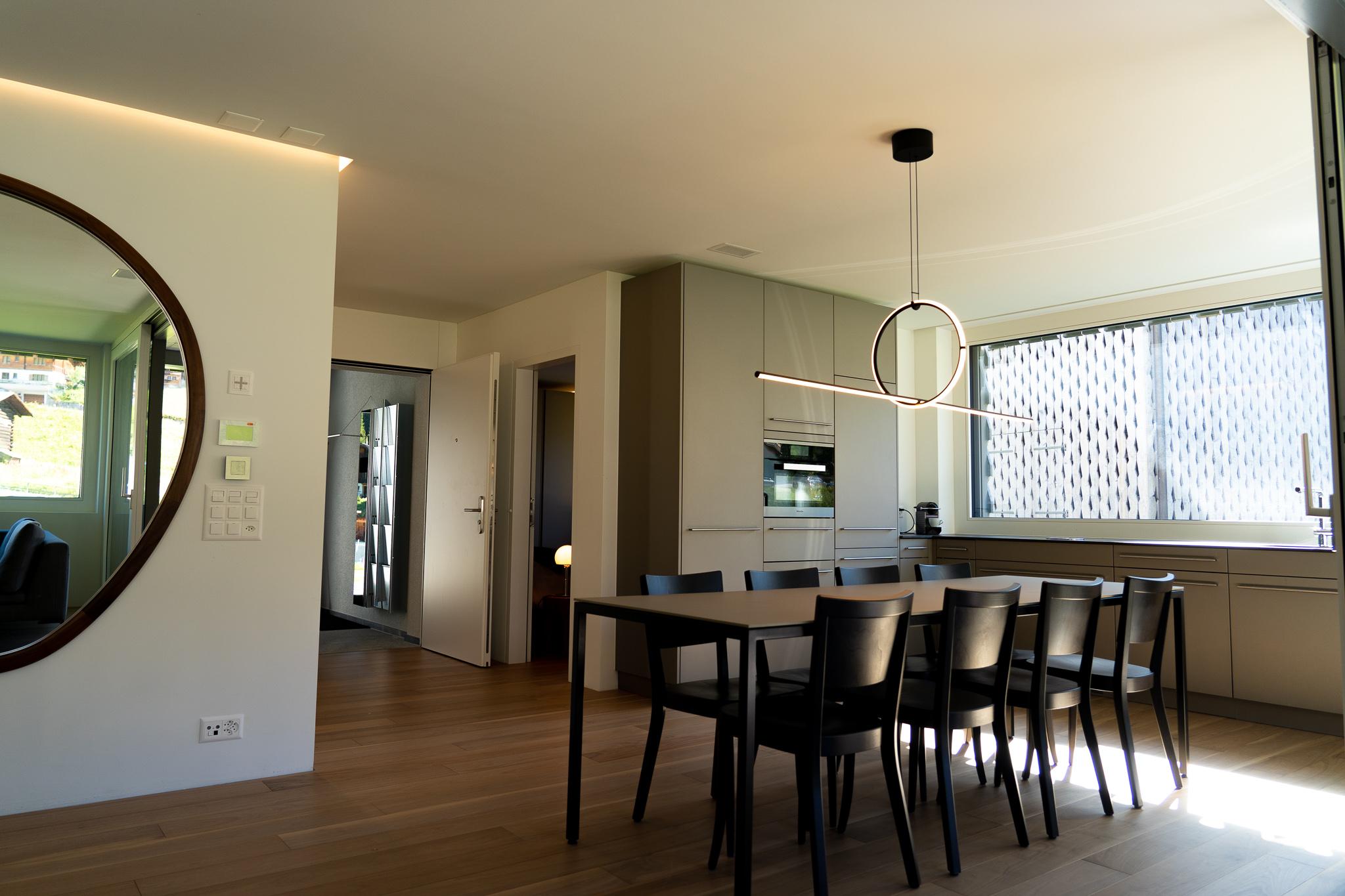 Die Wohnung verfügt über eine neuwertige Einrichtung im modernen Stil und bietet einen hohen Schlafkomfort mit Boxspringbetten. Die Wohnung Mitti ist im oberen Stock und hat eine tolle Aussicht auf die Kulmwiese und die schöne Bergwelt.
