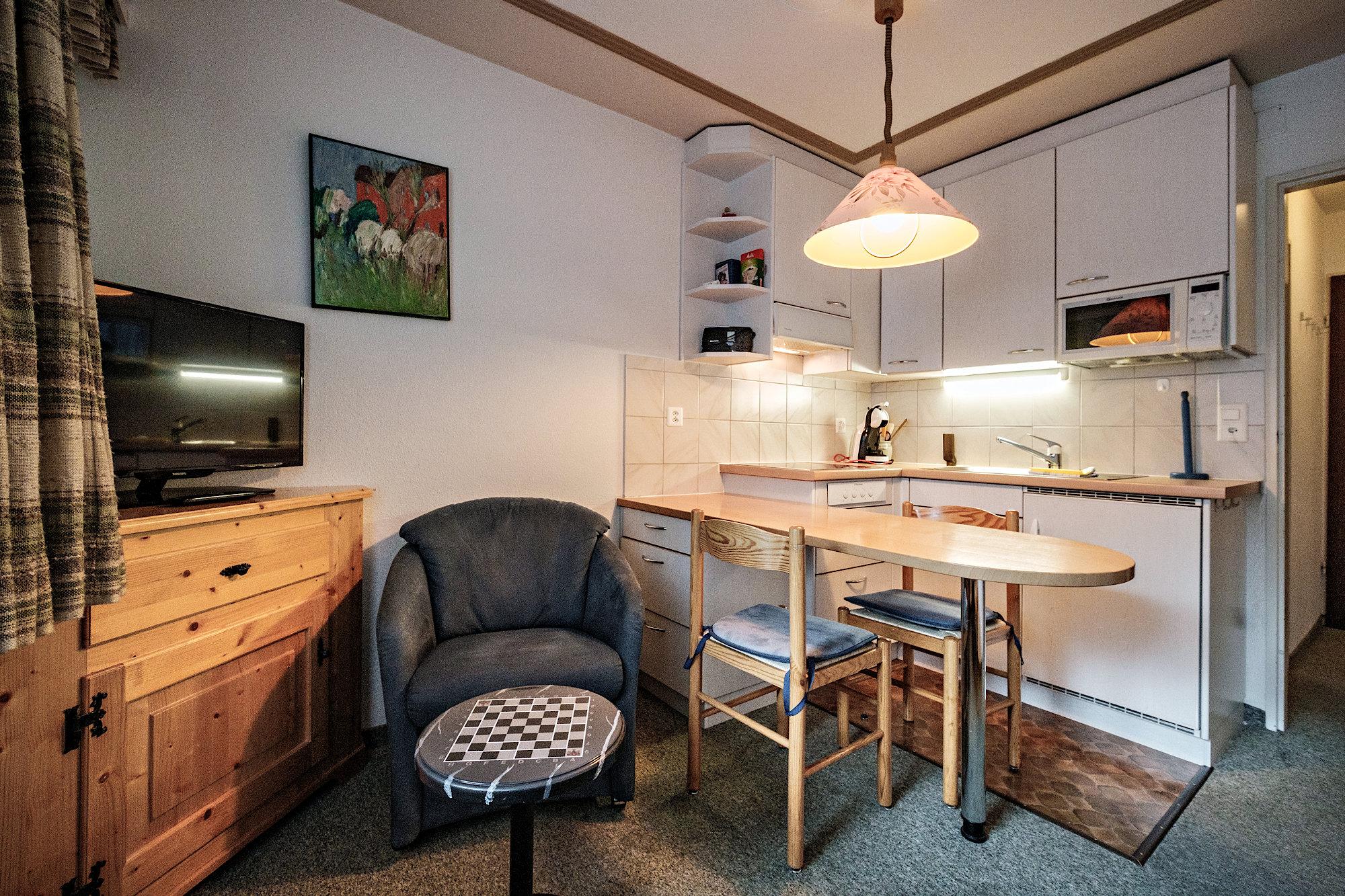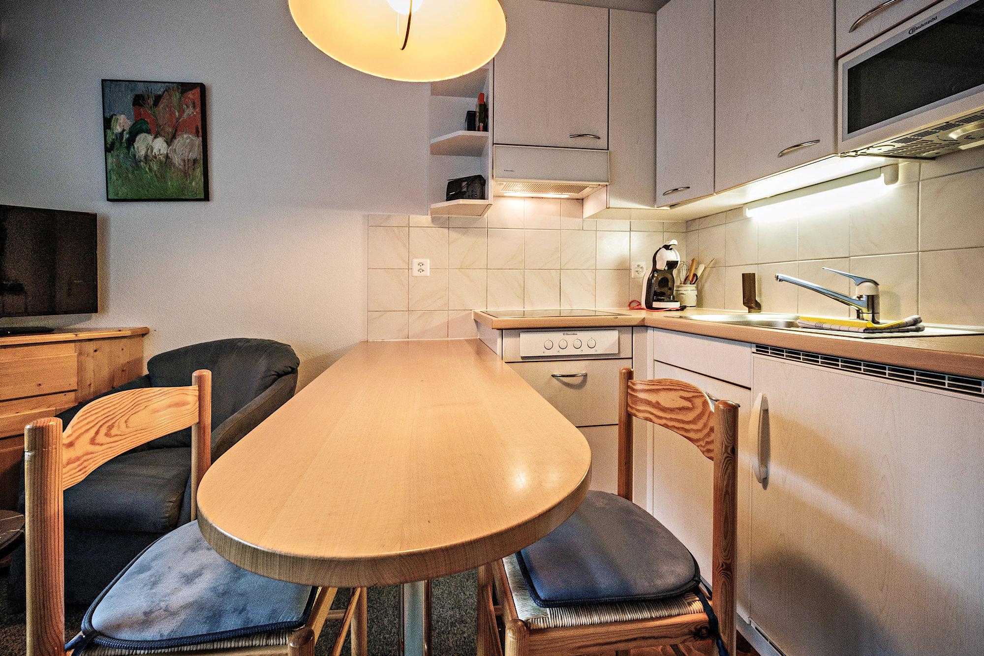 offene Küche mit Essbar, 4-Platten-Keramikkochherd, Mikrowellenofen, Kühlschrank, Kaffeemaschine, Fondueset