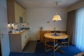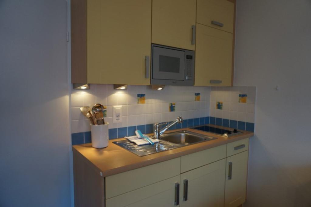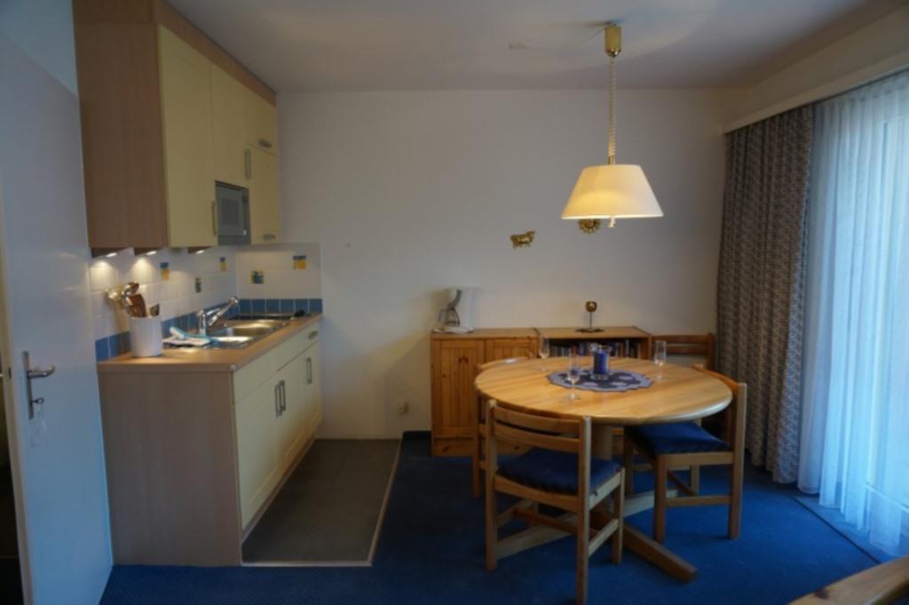 Abgetrennter Eingangsbereich mit grossem Kleiderschrank. Offene, moderne Kochnische mit 2 Platten-Keramikkochfeld, Mikrowelle und Kühlschrank. Die Küche ist sehr gut ausgestattet mit Wasserkocher, Toaster, Fondueset, Espressokocher, Kaffeefilterhalter für Filterkaffee, Isolierkanne, Teekanne mit Sieb für losen Tee, etc.
