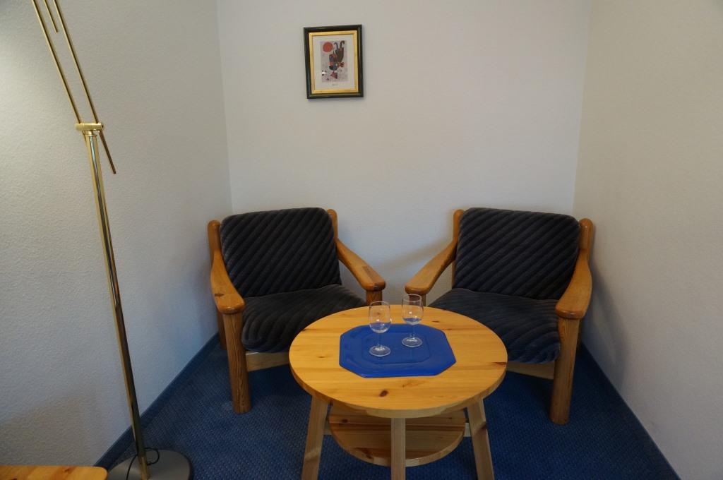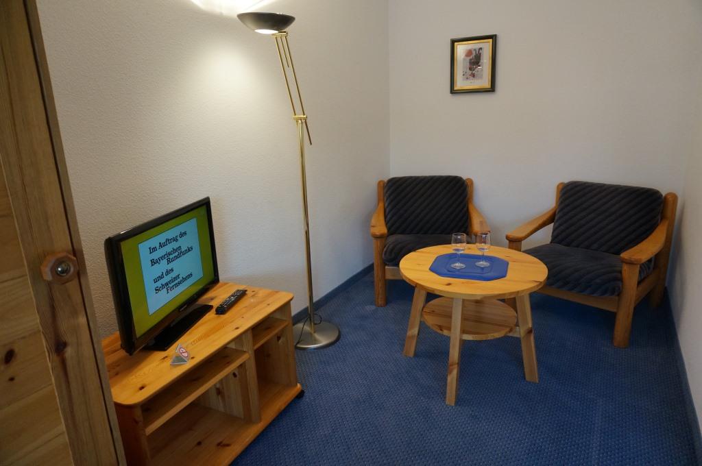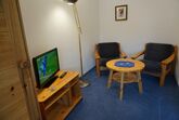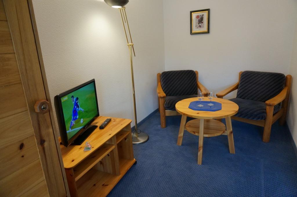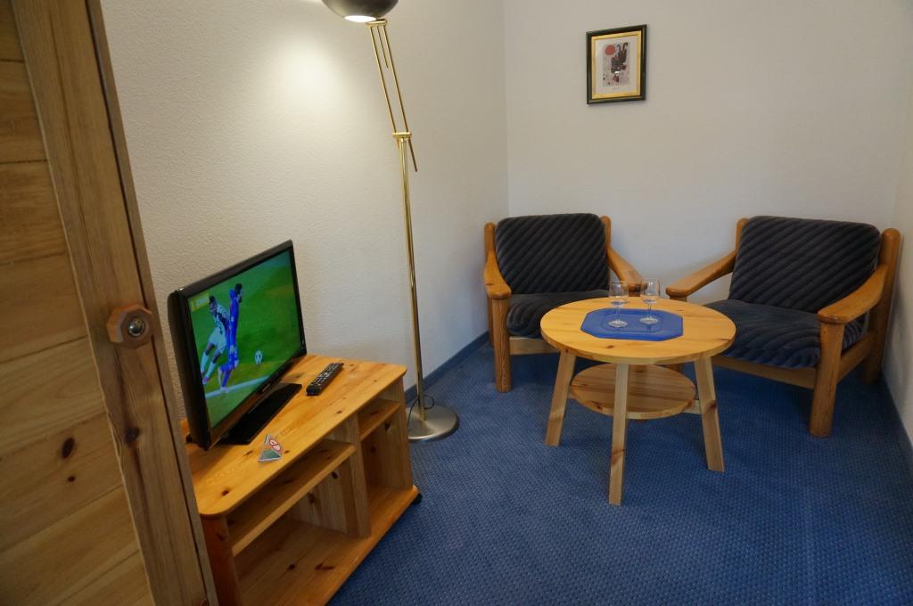 Wohnschlafzimmer in Kiefernholz eingerichtet mit 2 bequemen Schrankbetten, gemütlicher Sitzecke, Esstisch und TV.
