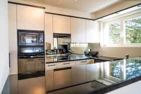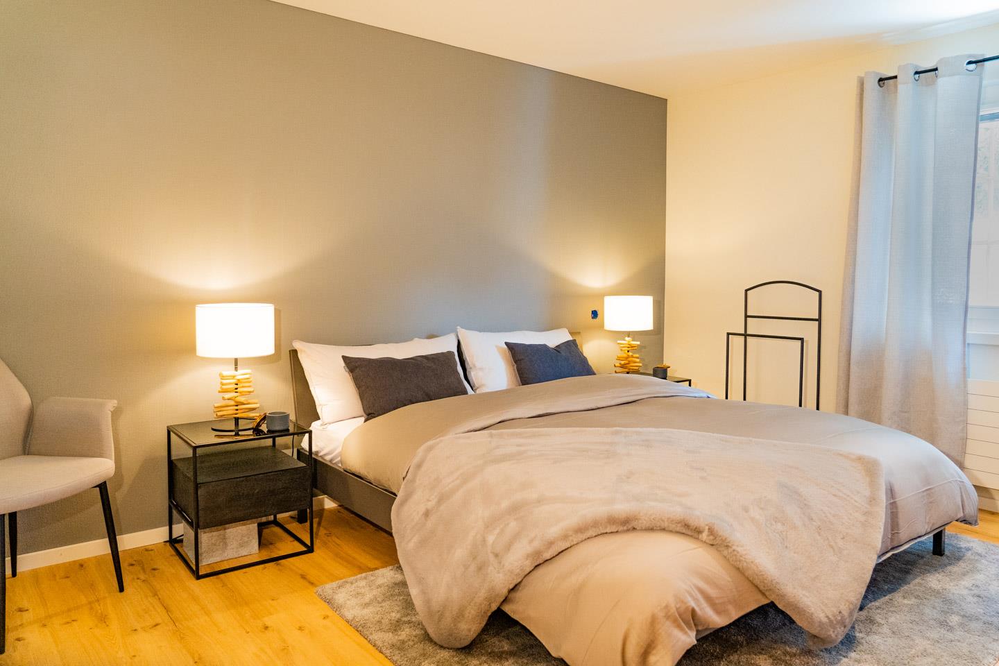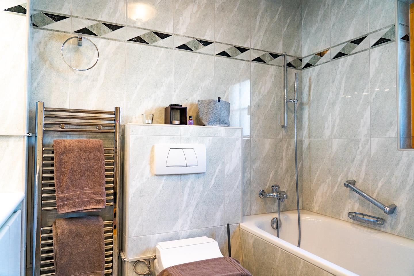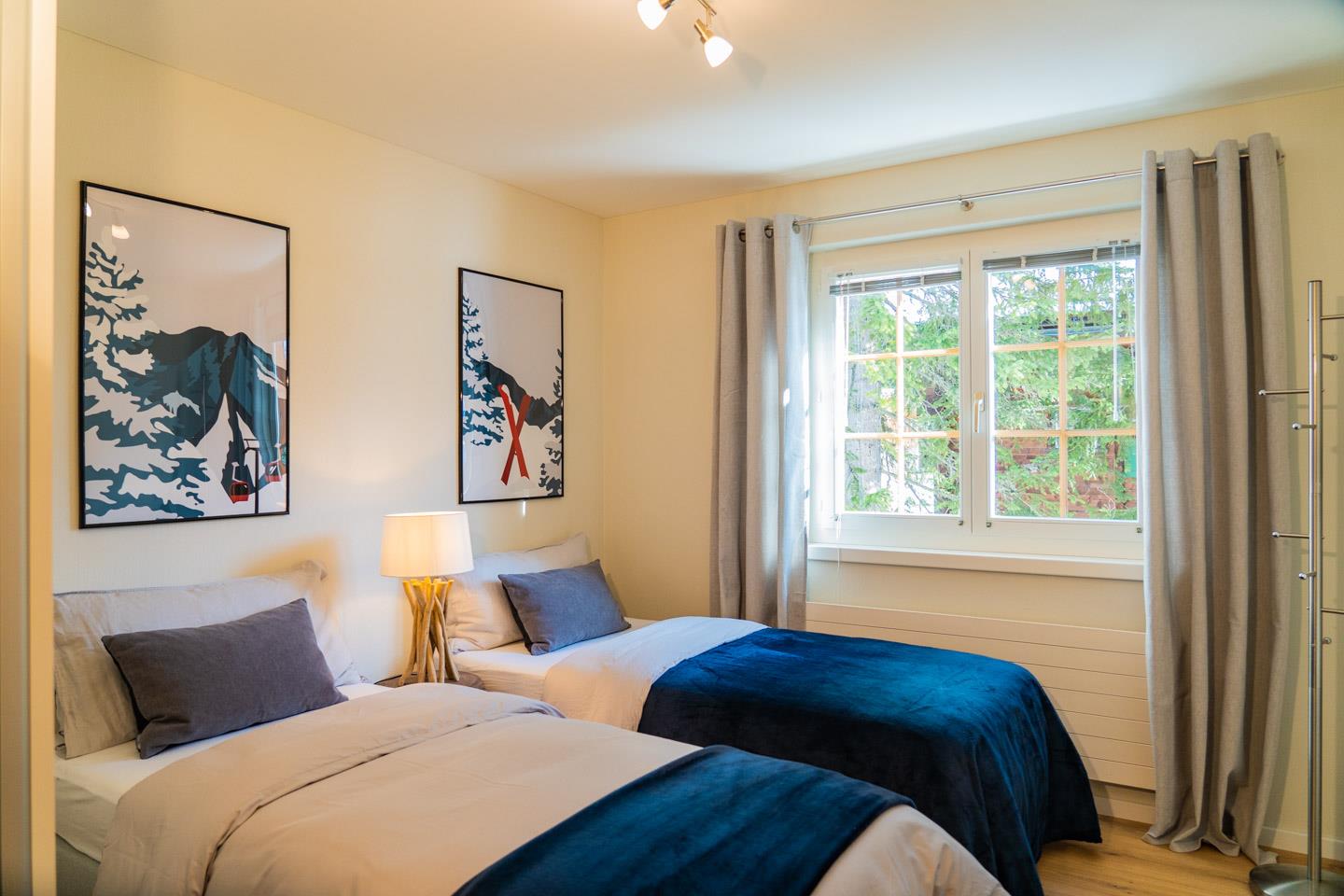 3 ½-Zimmer Ferienwohnung (85m2), mit Kamin und überdachtem Balkon, 2 Schlafzimmer und 2 Badezimmer. Dampfsauna