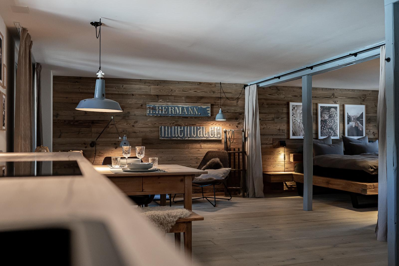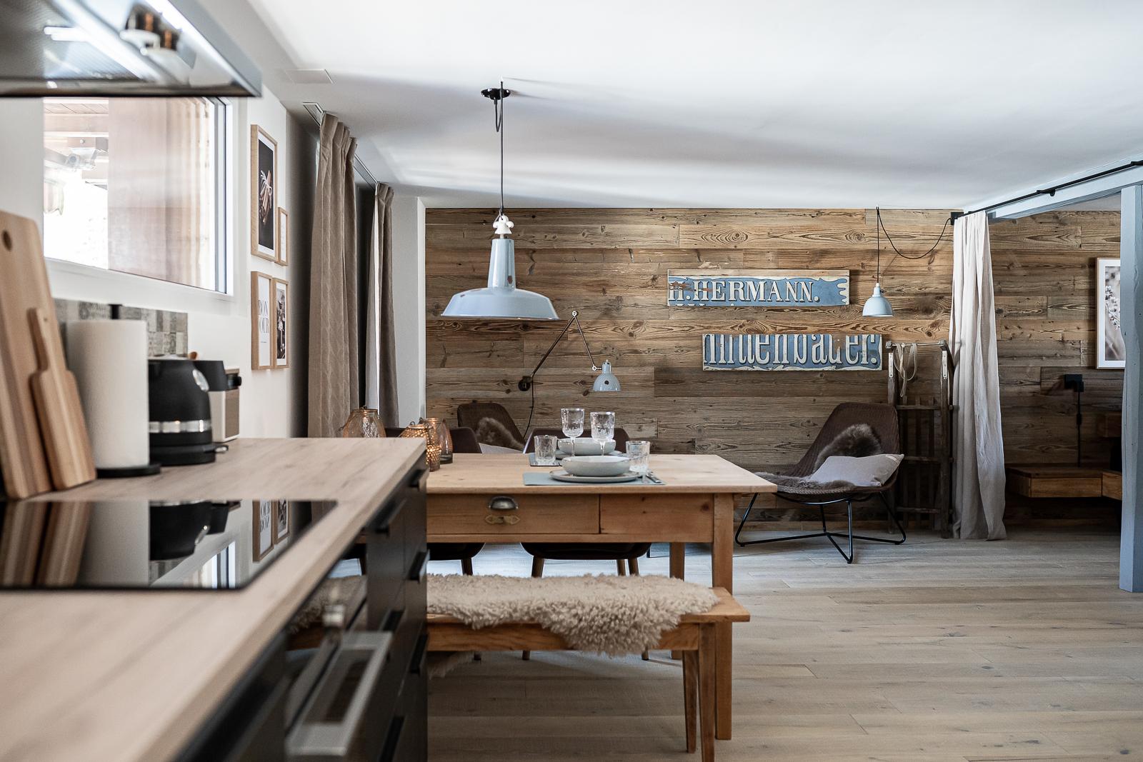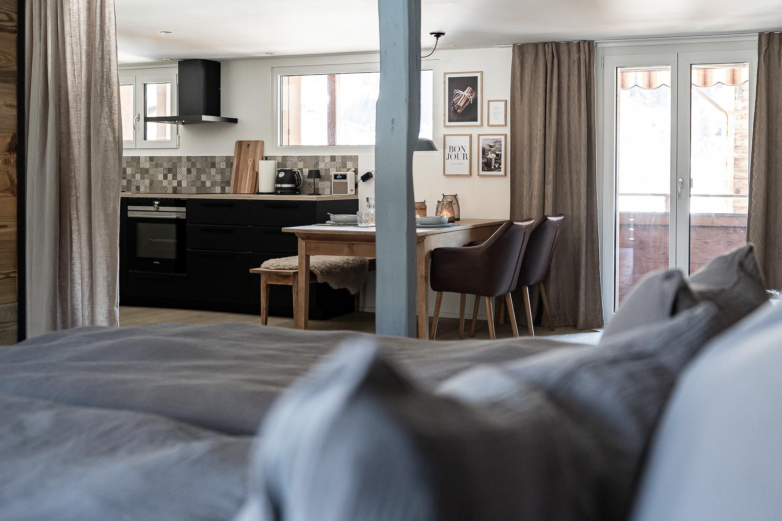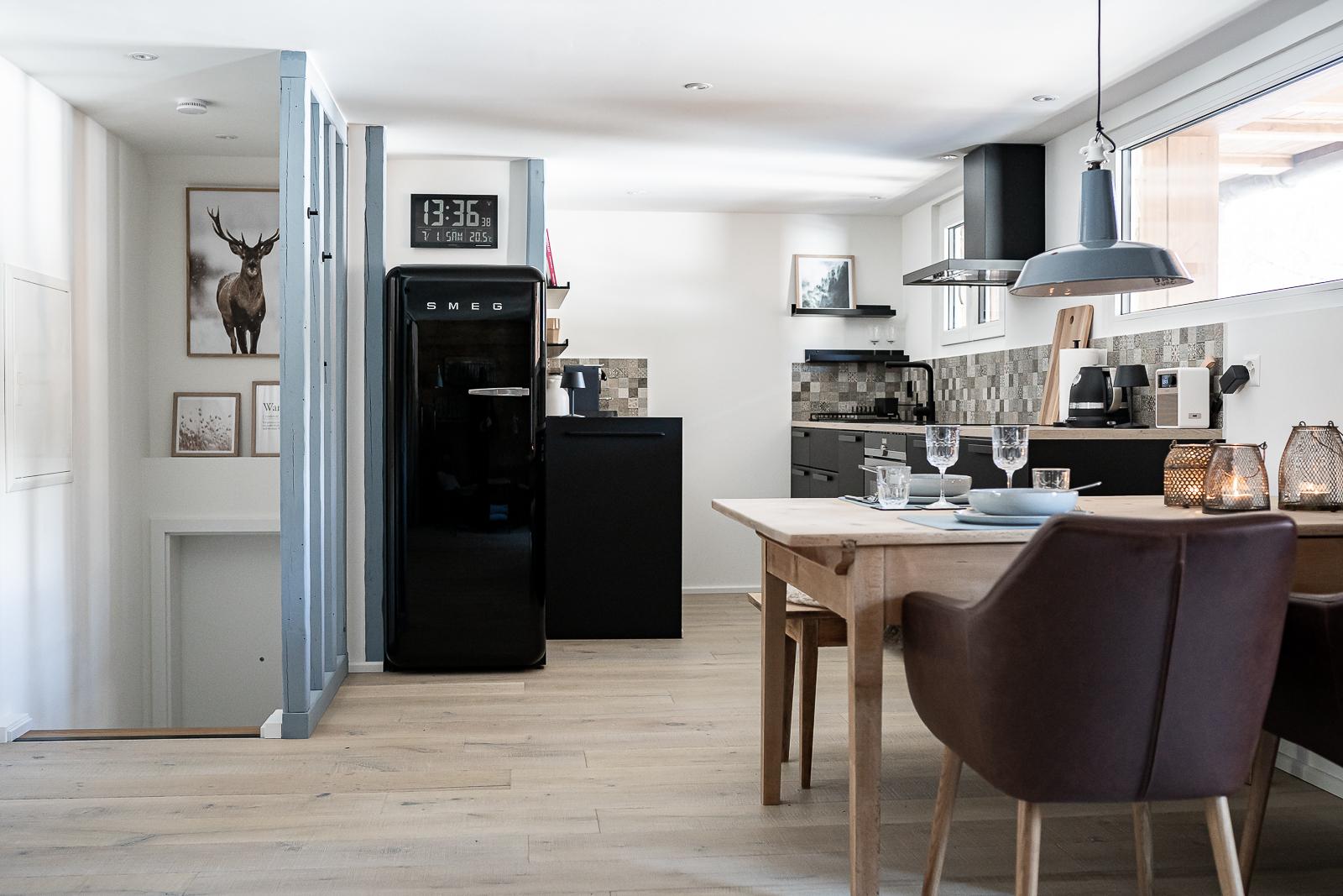 Unsere frisch renovierte Wohnung mit 50 m² bietet Rückzug für 2 Personen in einem offenen Wohn- und Schlafbereich. Der Duft von Altholz, natürlichen Farben und sinnlichen Stoffe prägen den schlicht-edlen Naturstil der Loft Wohnung. Zwei bequeme Lounge Sessel im gemütlichen Wohnbereich laden Sie zum Verweilen ein. Der Küchenbereich ist mit Geschirrspülmaschine, Kaffeemaschine, Wasserkocher, Backofen, Induktionsherd, Geschirr und Besteck vollausgestattet. Ein wahrer Hingucker ist der freistehende Kühlschrank mit kleinem Gefrierfach. Der antike Küchentisch lädt ein für Genussmomente, Spielabende, lesen, schreiben sowie genügend Platz für Homeoffice. Im Schlafbereich befindet sich ein großes Doppelbett aus massivem Eichenholz und zwei Einzelmatratzen mit je 90x200cm. Die Decken und Kissen sind aus hochwertigen Daunen. Ein großer Flachbildschirm sorgt für gemütliche Filmabende. Rückseitig befinden sich die Kleiderschränke und die Garderobe. Der einzig schließbare Raum ist das großzügige Badezimmer. Das schlicht-edle Bad ist die zeitgemäße Interpretation einer traditionellen Berghütte mit viel Holz. Modern, ohne kühl zu sein. Die kleine alte Werkbank wurde zu einem Waschtisch umfunktioniert und der große Runde Spiegel füllt den Raum mit noch mehr Tiefe aus. Eine grosse Regendusche ergänzt das Wellness Angebot und die moderne Badewanne lädt zum Relaxen ein, mit einer wunderbaren Sicht auf das Schiesshorn.