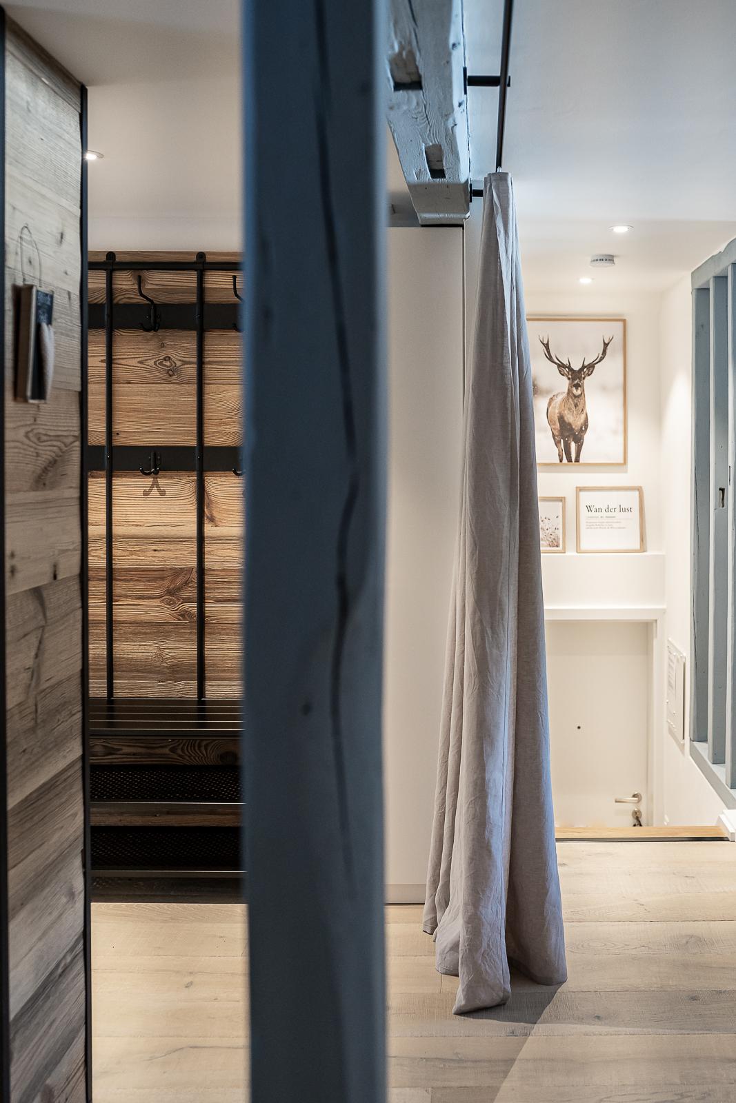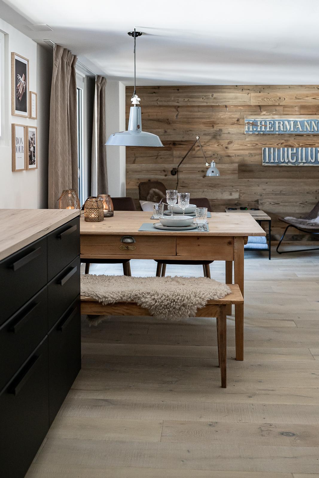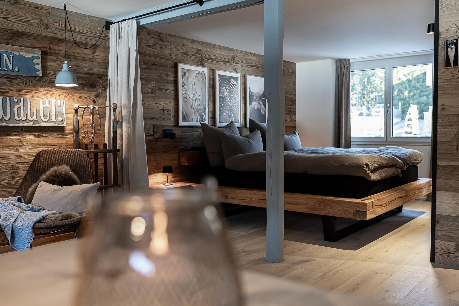 Unsere frisch renovierte Wohnung mit 50 m² bietet Rückzug für 2 Personen in einem offenen Wohn- und Schlafbereich. Der Duft von Altholz, natürlichen Farben und sinnlichen Stoffe prägen den schlicht-edlen Naturstil der Loft Wohnung. Zwei bequeme Lounge Sessel im gemütlichen Wohnbereich laden Sie zum Verweilen ein. Der Küchenbereich ist mit Geschirrspülmaschine, Kaffeemaschine, Wasserkocher, Backofen, Induktionsherd, Geschirr und Besteck vollausgestattet. Ein wahrer Hingucker ist der freistehende Kühlschrank mit kleinem Gefrierfach. Der antike Küchentisch lädt ein für Genussmomente, Spielabende, lesen, schreiben sowie genügend Platz für Homeoffice. Im Schlafbereich befindet sich ein großes Doppelbett aus massivem Eichenholz und zwei Einzelmatratzen mit je 90x200cm. Die Decken und Kissen sind aus hochwertigen Daunen. Ein großer Flachbildschirm sorgt für gemütliche Filmabende. Rückseitig befinden sich die Kleiderschränke und die Garderobe. Der einzig schließbare Raum ist das großzügige Badezimmer. Das schlicht-edle Bad ist die zeitgemäße Interpretation einer traditionellen Berghütte mit viel Holz. Modern, ohne kühl zu sein. Die kleine alte Werkbank wurde zu einem Waschtisch umfunktioniert und der große Runde Spiegel füllt den Raum mit noch mehr Tiefe aus. Eine grosse Regendusche ergänzt das Wellness Angebot und die moderne Badewanne lädt zum Relaxen ein, mit einer wunderbaren Sicht auf das Schiesshorn.