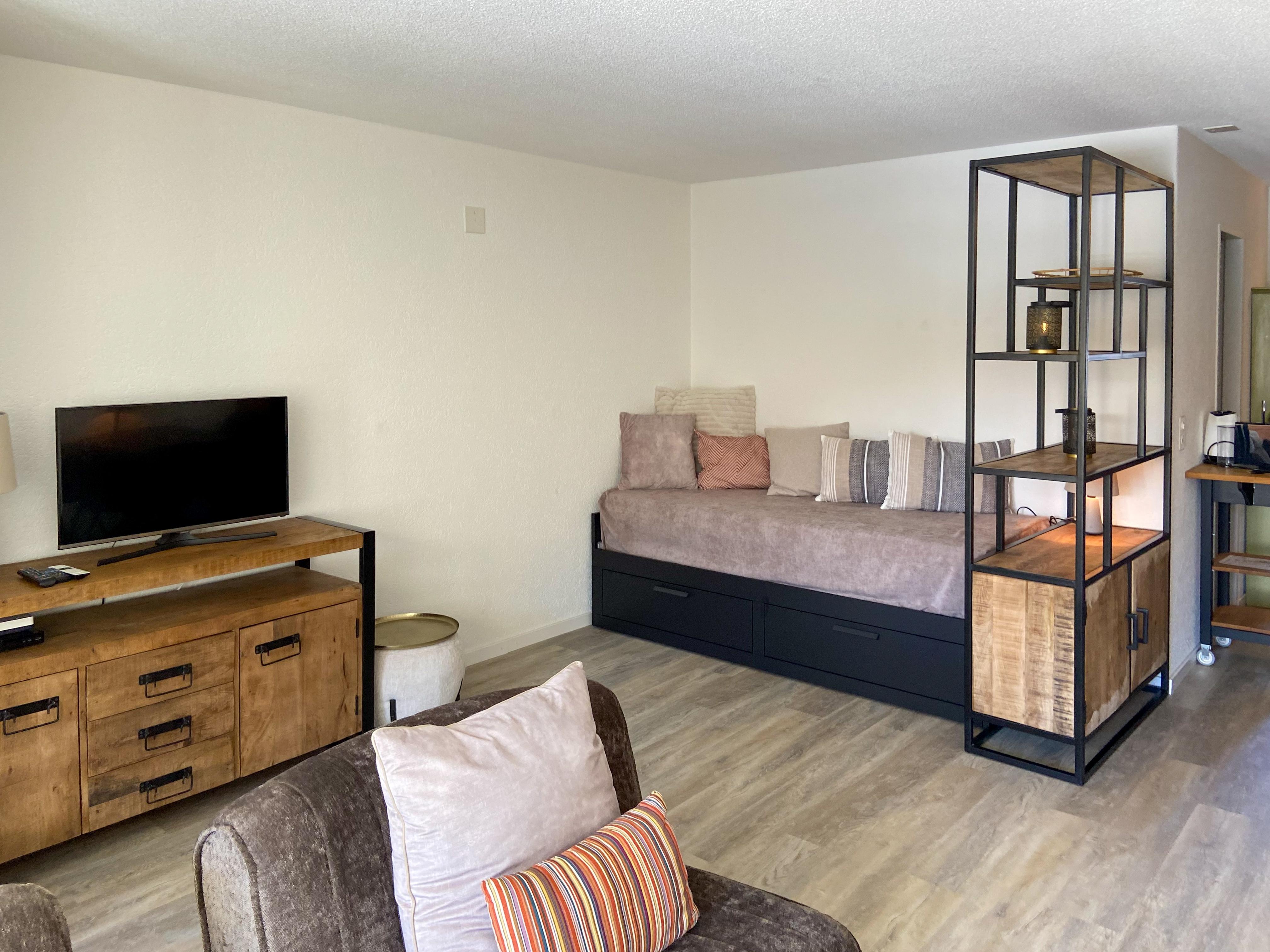 Geräumiges Wohn- und Esszimmer mit Schrankbett (für 2 Personen) und Kamin