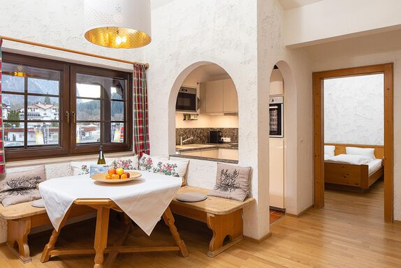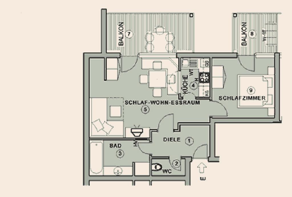 Das stilvolle 2-Raum-Apartment „Jasmin“ bietet auf ca. 48 m² Platz für 2 bis 4 Personen. Es verfügt über ein Doppelzimmer mit Balkonzugang, ein offenes Wohn-/Esszimmer mit Eckbank, Smart-TV und Schlafsofa, eine gut ausgestattete Kochnische (inkl. Herd, Spülmaschine, Mikrowelle, Kaffeemaschine u. v. m.), ein Bad mit Wanne sowie ein separates WC. Zwei großzügige Balkone mit insgesamt ca. 15 m² runden das Angebot ab.