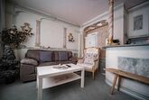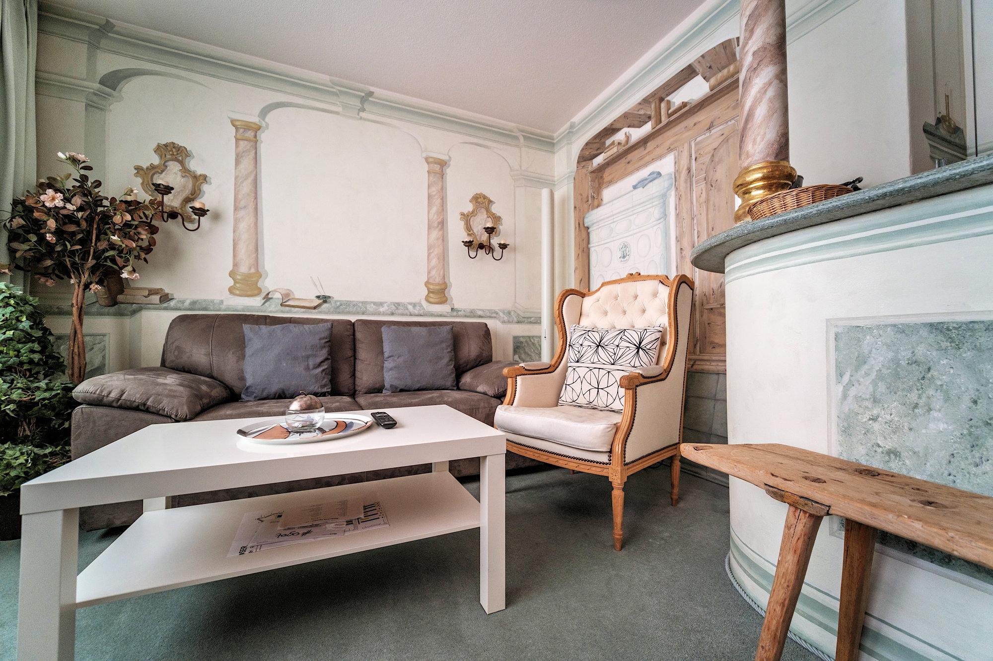 Wohnzimmer mit teilweise antiker Möblierung, z.B. Esstisch mit Stabellen, gemütlichem Sofa, Sessel, Sat-TV und Radio/CD,WLAN