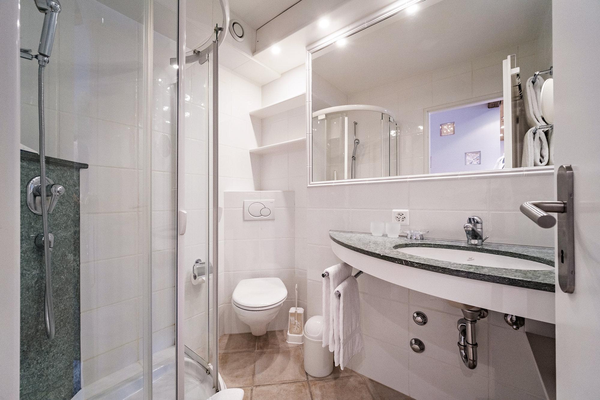 In Granit und Glas gestaltete Dusche/WC mit Fön, Kosmetikspiegel