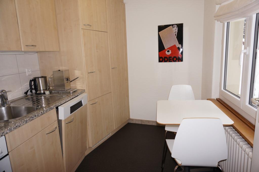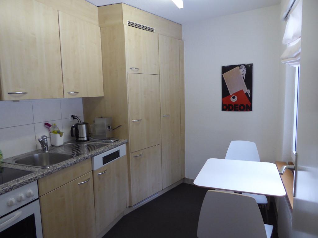 Separate neuzeitliche Küche (Blick zum Wald), 3-Platten-Keramikkochherd, Backofen, Geschirrspüler, Kühlschrank, Kaffeemaschine, Fondue-, Raclette- und Fleischfondueset, Wasserkocher, Toaster, kleiner Esstisch