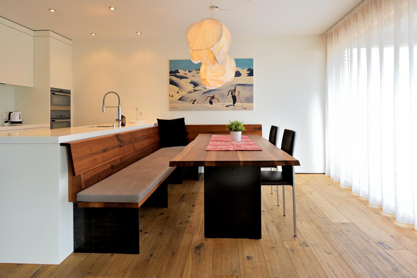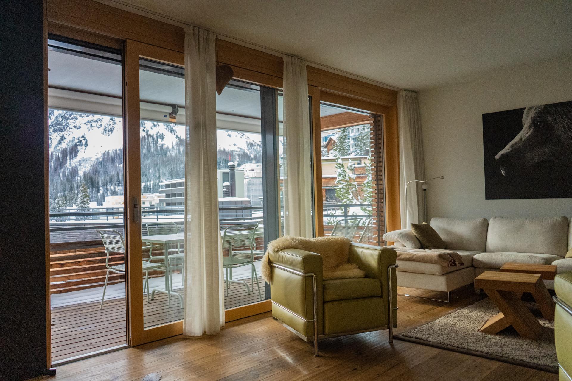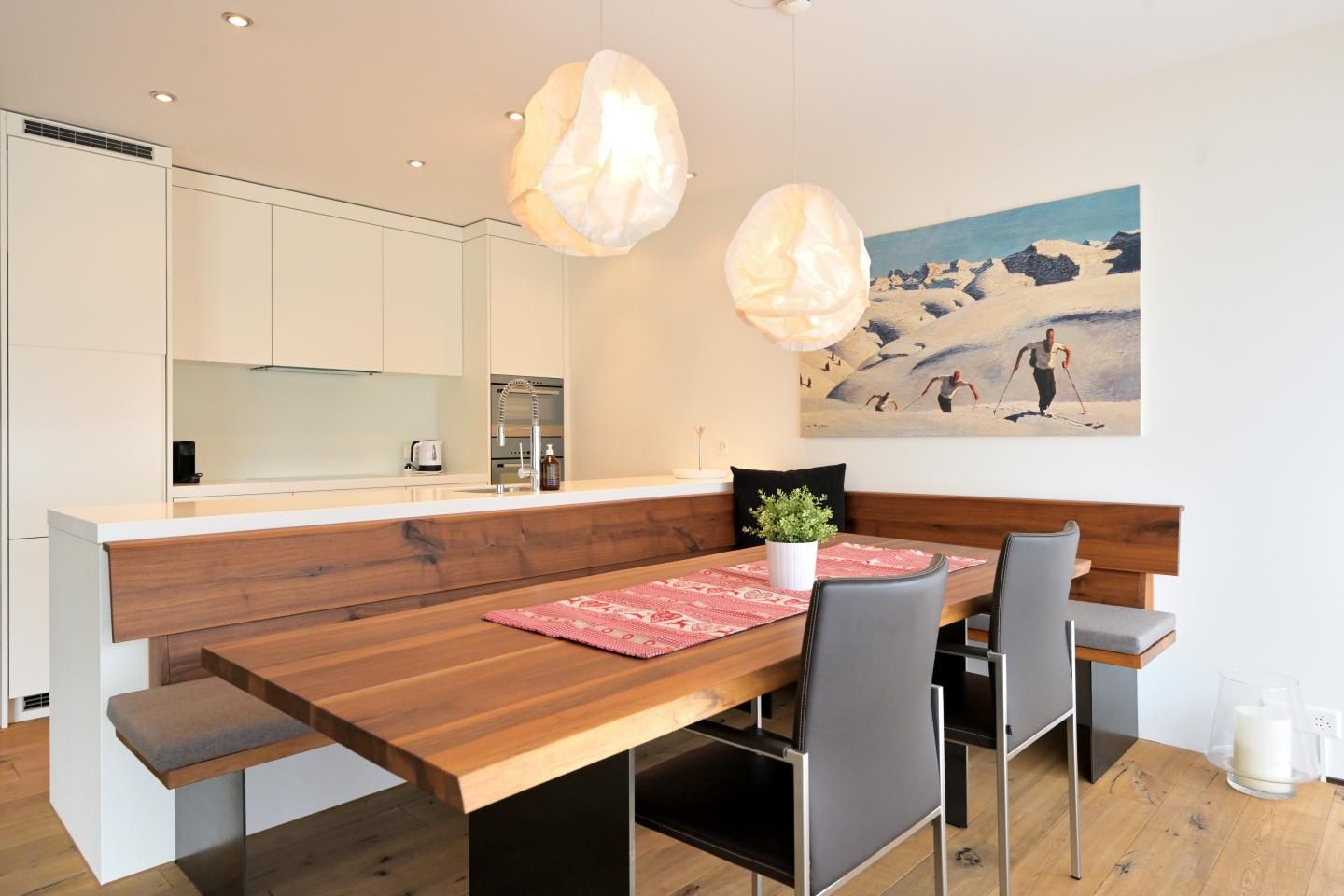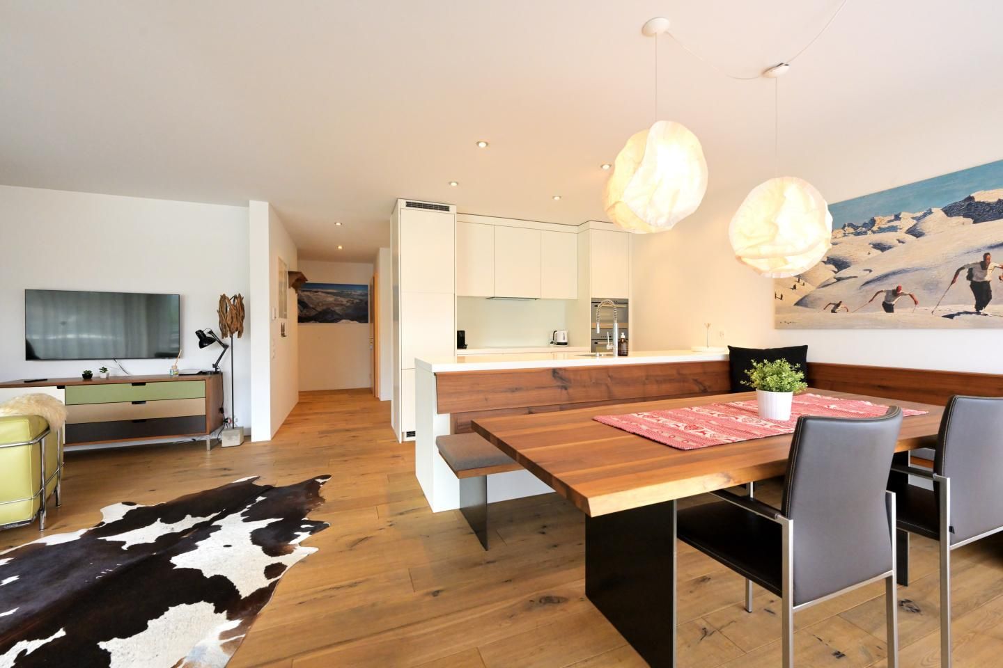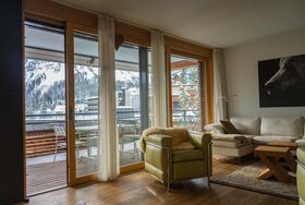 Moderne 3½ -Zimmer Ferienwohnung (95m2) mit gemütlichem Wohn-/Küchenbereich, Kamin und überdecktem Balkon mit teilweisem Blick auf die Arosa Berge. 2 Schlafzimmer, 2 Badezimmer, 1 Garagenplatz und Skiraum. Bushaltestelle ist nicht weit weg und Supermarkt in 3 Minuten zu Fuss erreichbar.