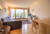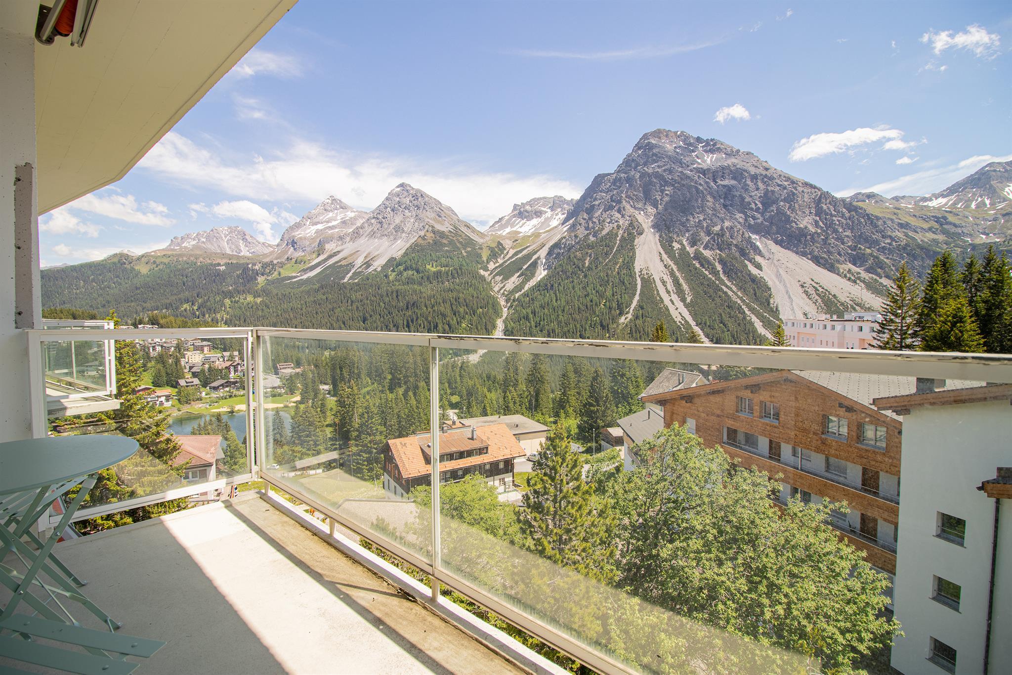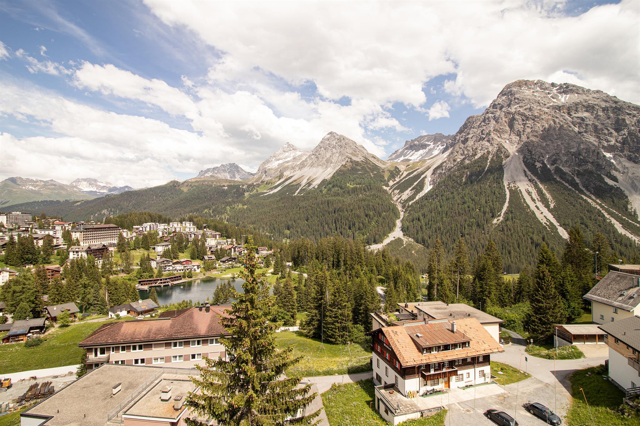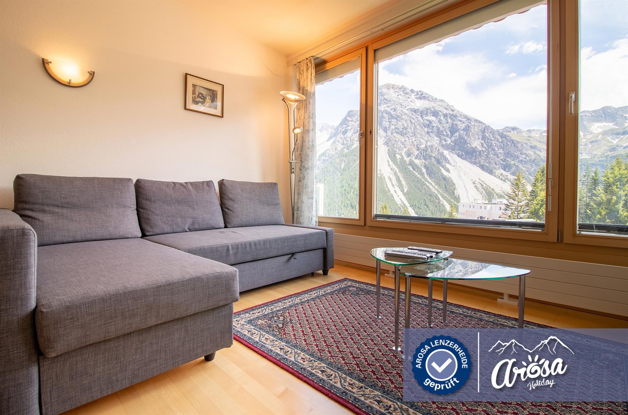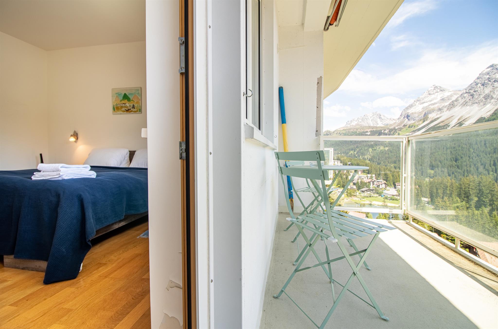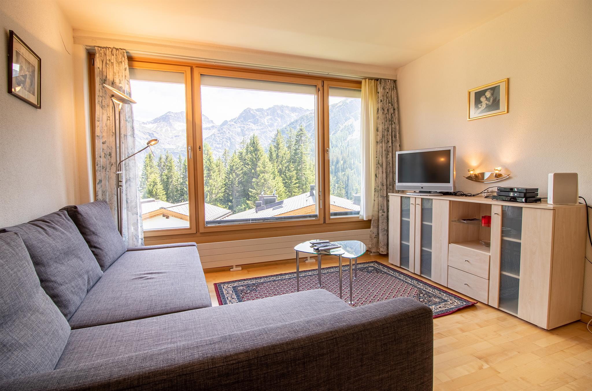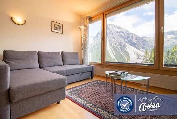 Das Wohnzimmer und das Schlafzimmer haben einen spektakulären Blick auf die Berge und Arosa, und alle Möbel sind neu.