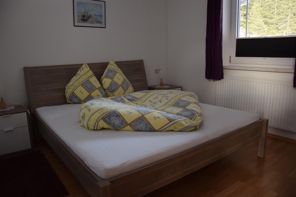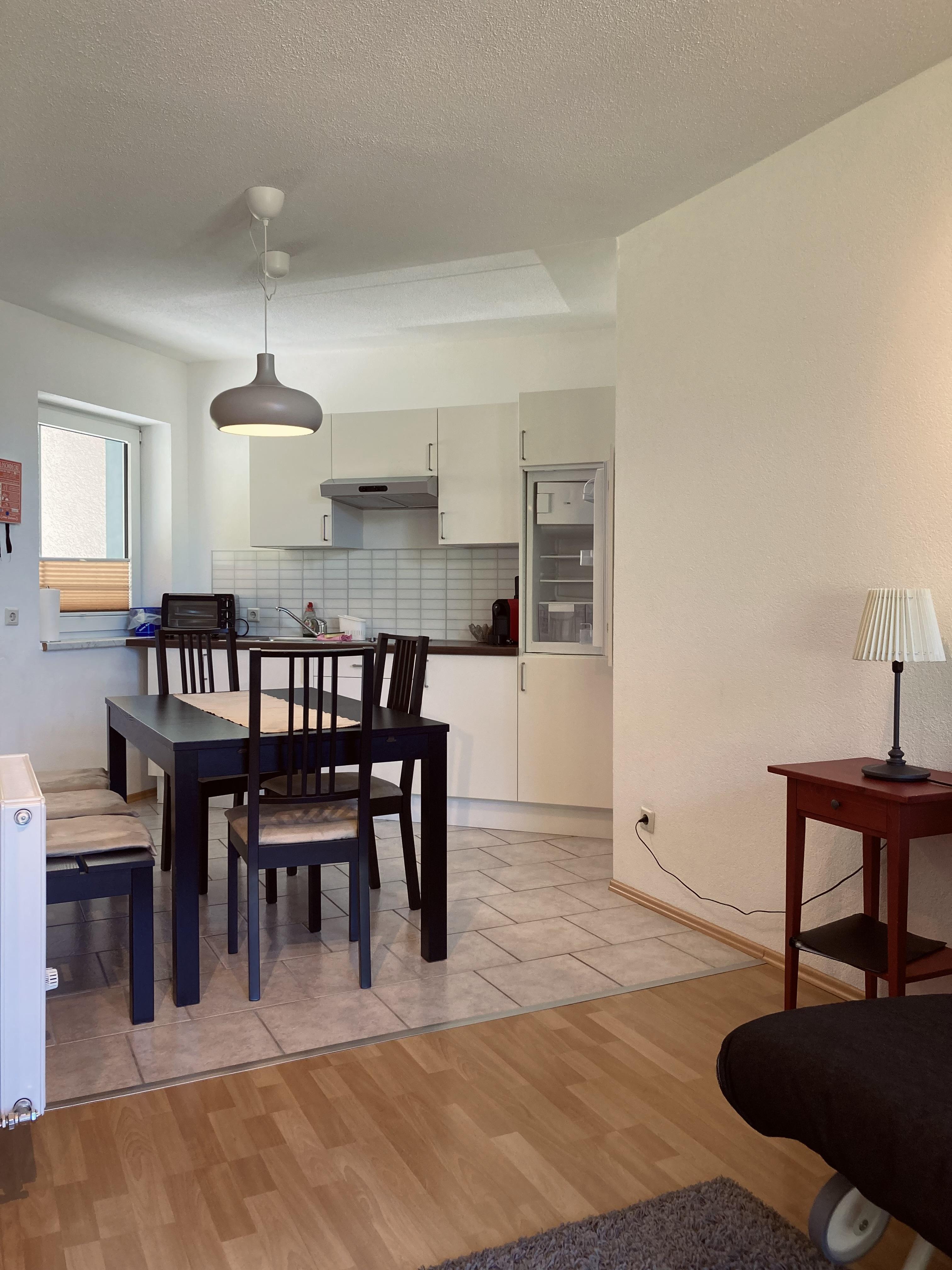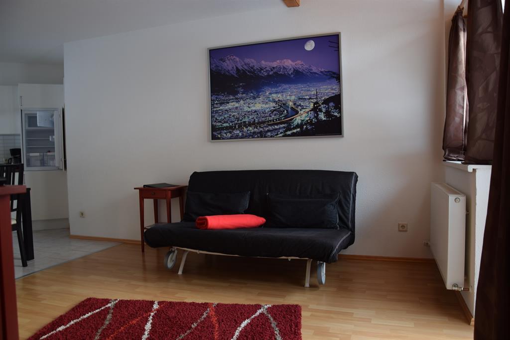 Hell, einfach und gemütlich eingerichtet: Schlafzimmer mit Doppelbett, Wohn-Schlafraum mit Schlafsofa und mit Sat-TV, offene Küche - top ausgestattete Küchenzeile mit Esstisch. Ausgang zum Balkon.