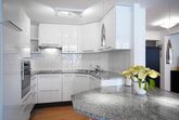 Keramikkochfeld, Dampfabzug, Backofen, Kühlschrank mit Gefrierfach, Koch- und Essgeschirr, Geschirrspüler, Kaffeemaschine, Espressomaschine, Tischgrill, Fondue-Set