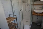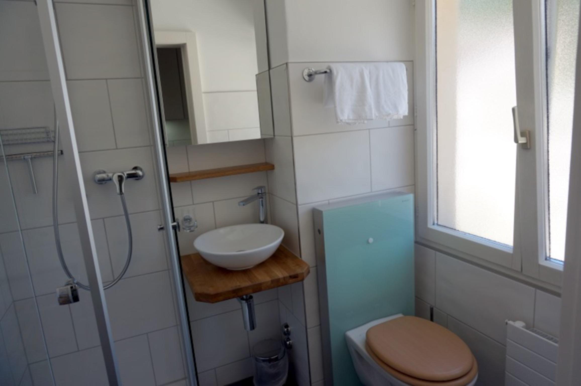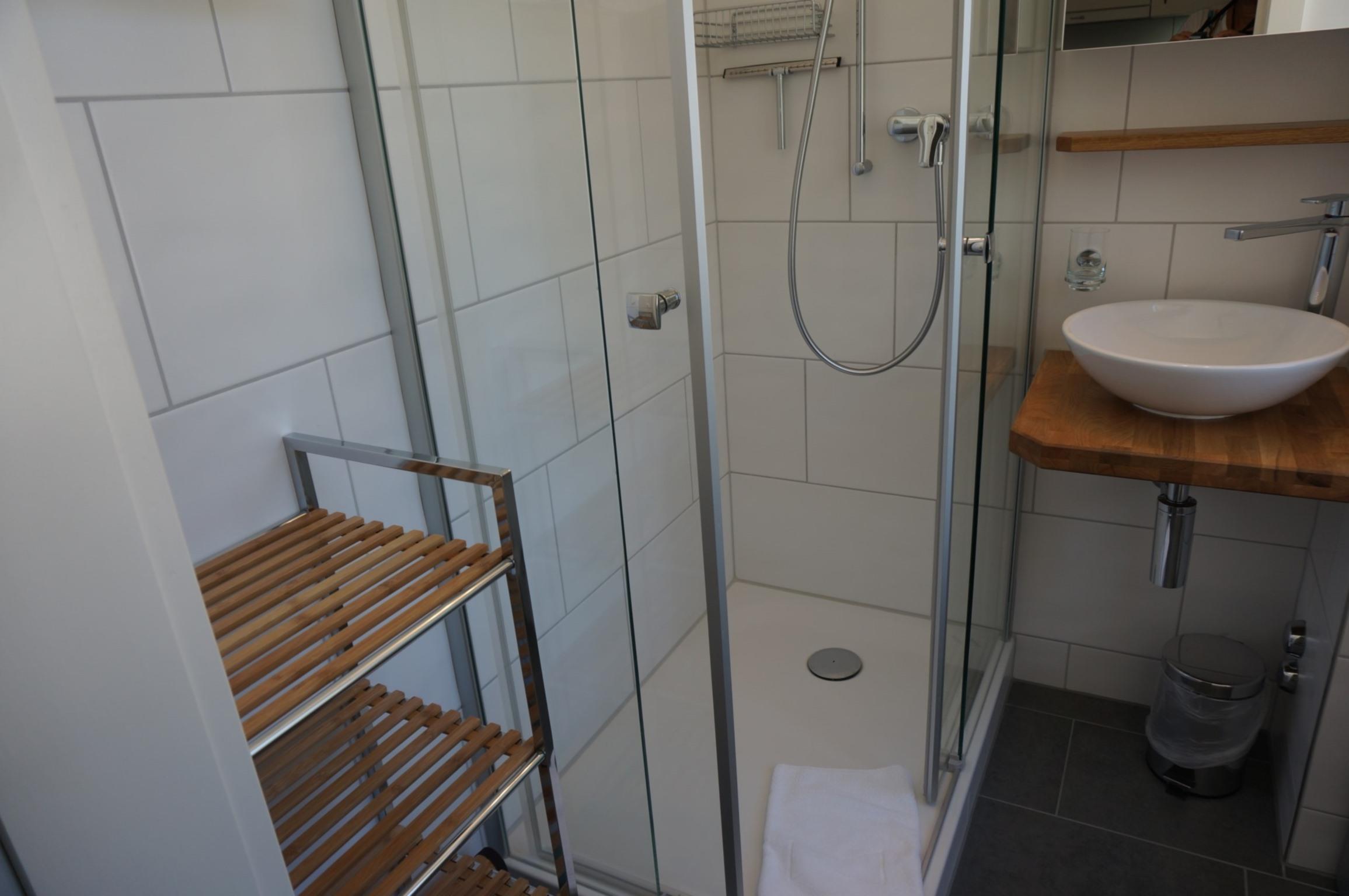 kleines Schlafzimmer mit 2 Betten nebeneinander und Dusche/WC .