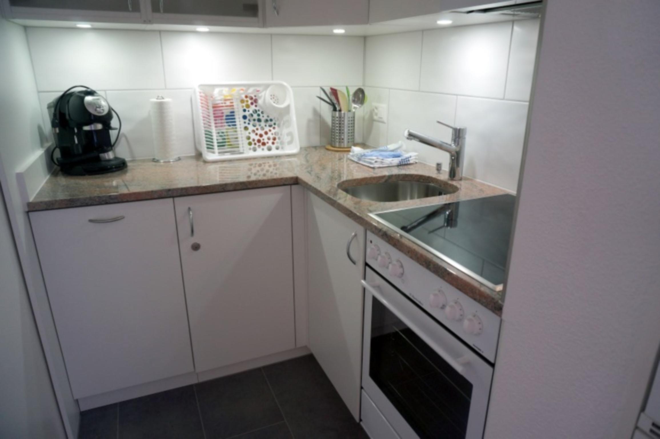 Offene Küche mit 4Kochplatten-Glaskeramikherd, Kühlschrank,Geschirrspüler, Backofen, Kaffeemaschine, Fondue/Racletteset, Espressomaschine etc.