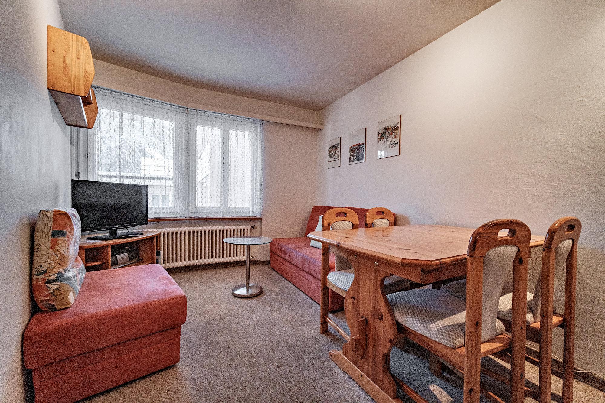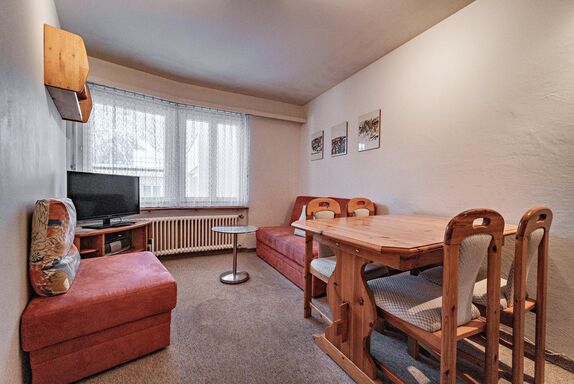 Wohn-/ Esszimmer mit Sofa und Sitzhocker, Esstisch, Radio/CD, Sat-TV