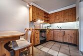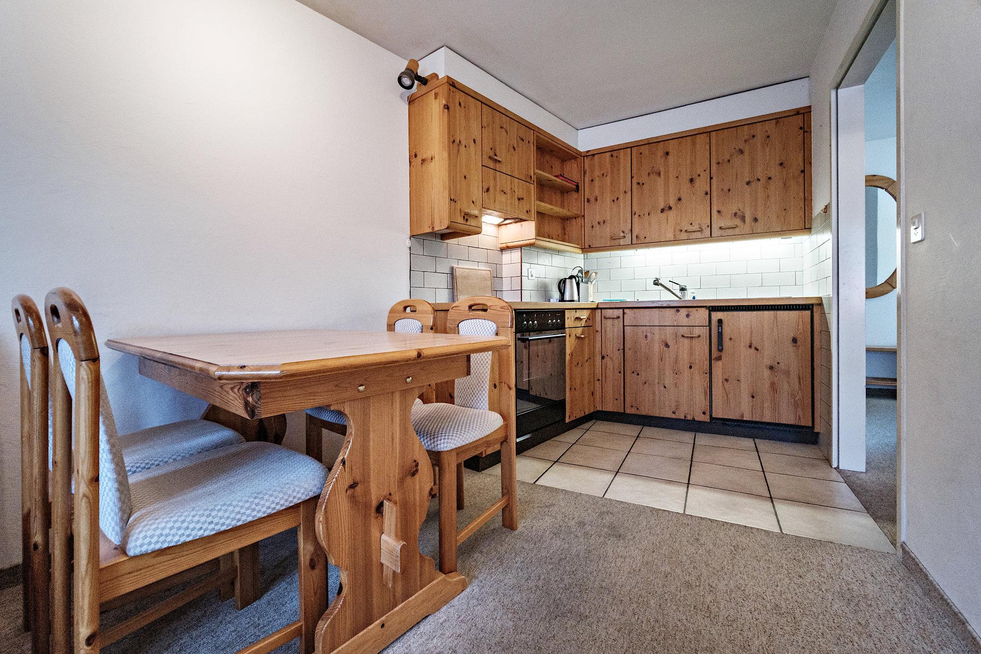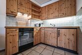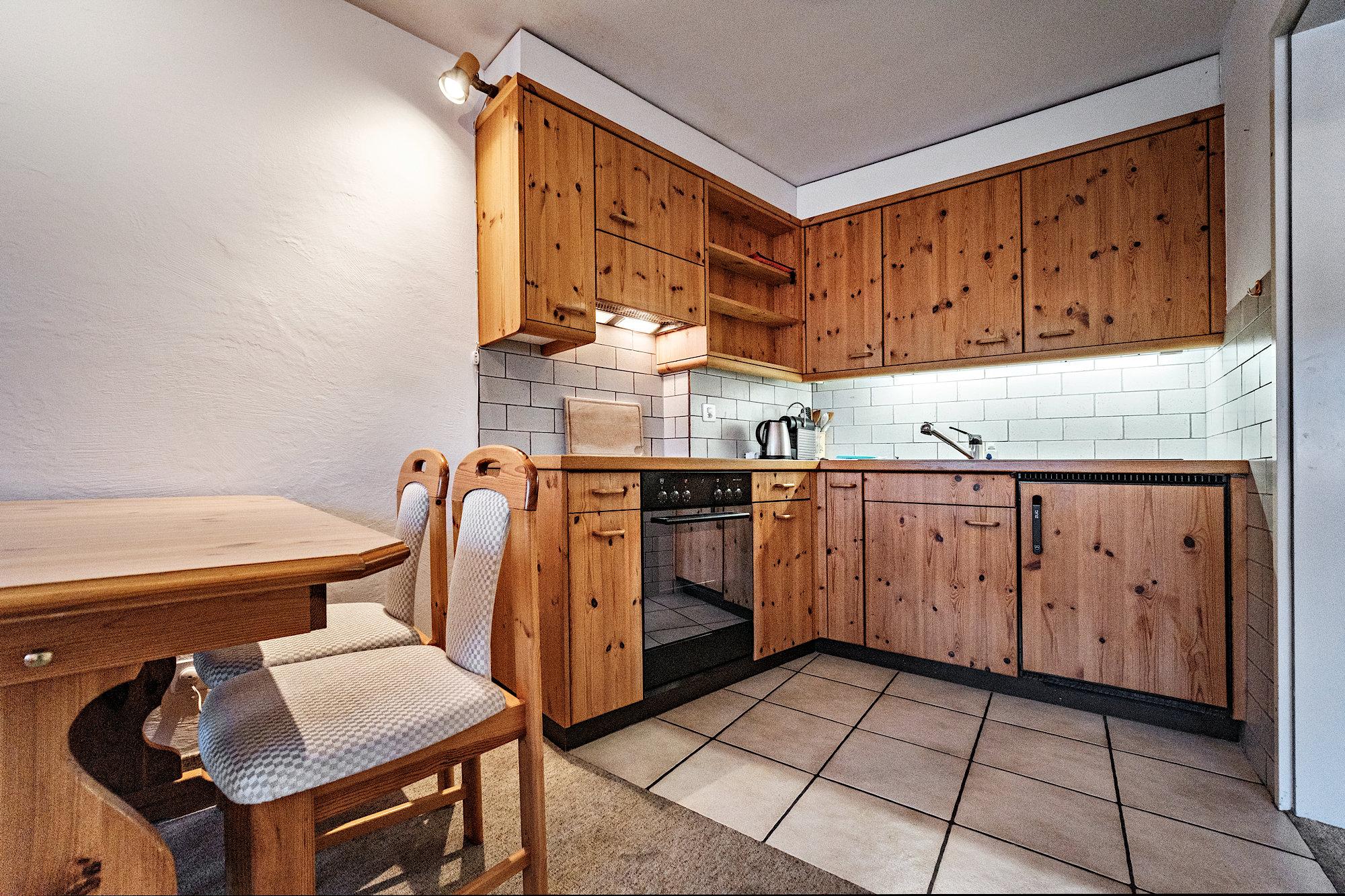 Offene Holzküche mit 4-Platten-Keramikkochherd, Backofen, Kühlschrank, Kaffeemaschine, Fondueset