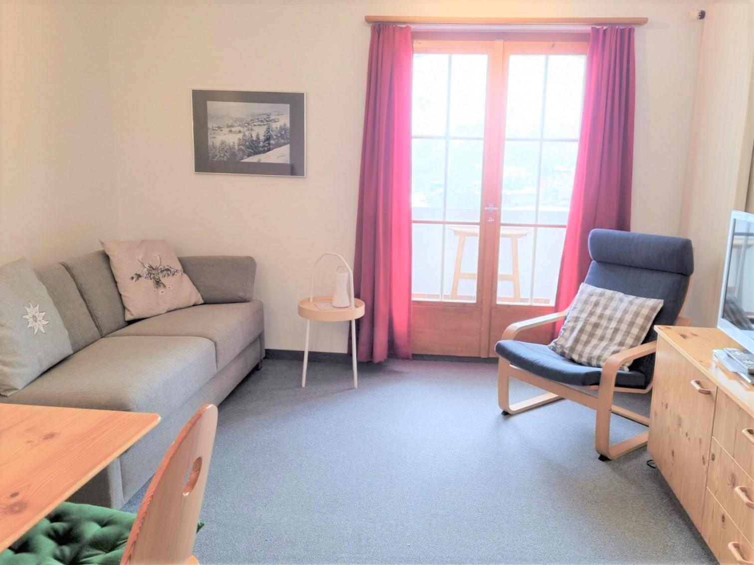 • Wohnzimmer mit Süd-Balkon mit freiem Blick auf Obersee und Berge. Esstisch. Bettsofa (mit Lattenrost/Matratze - 140 x 200)