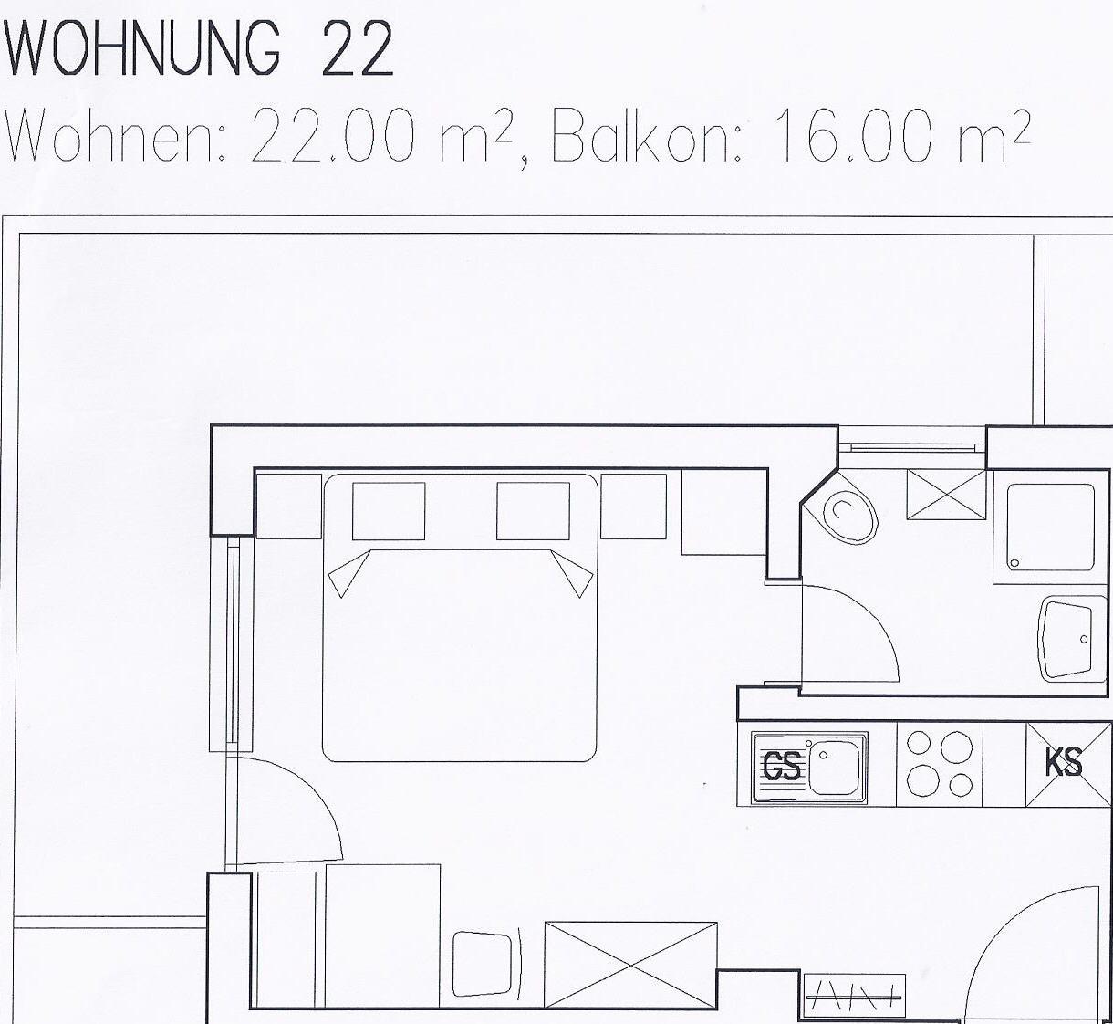 Appartement 22 ( 22m²) beinhaltet eine vollausgestattete Küche mit Geschirrspüler, Dusche/ WC, TV und WLan.
