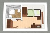 modernes Einzelzimmer (mit Grand Lit - 1,40 m breit) mit Dusche und WC, Haarföhn, Telefon, Kabel-TV (Flachbildschirm) und Zimmersafe. Größe: 14m².