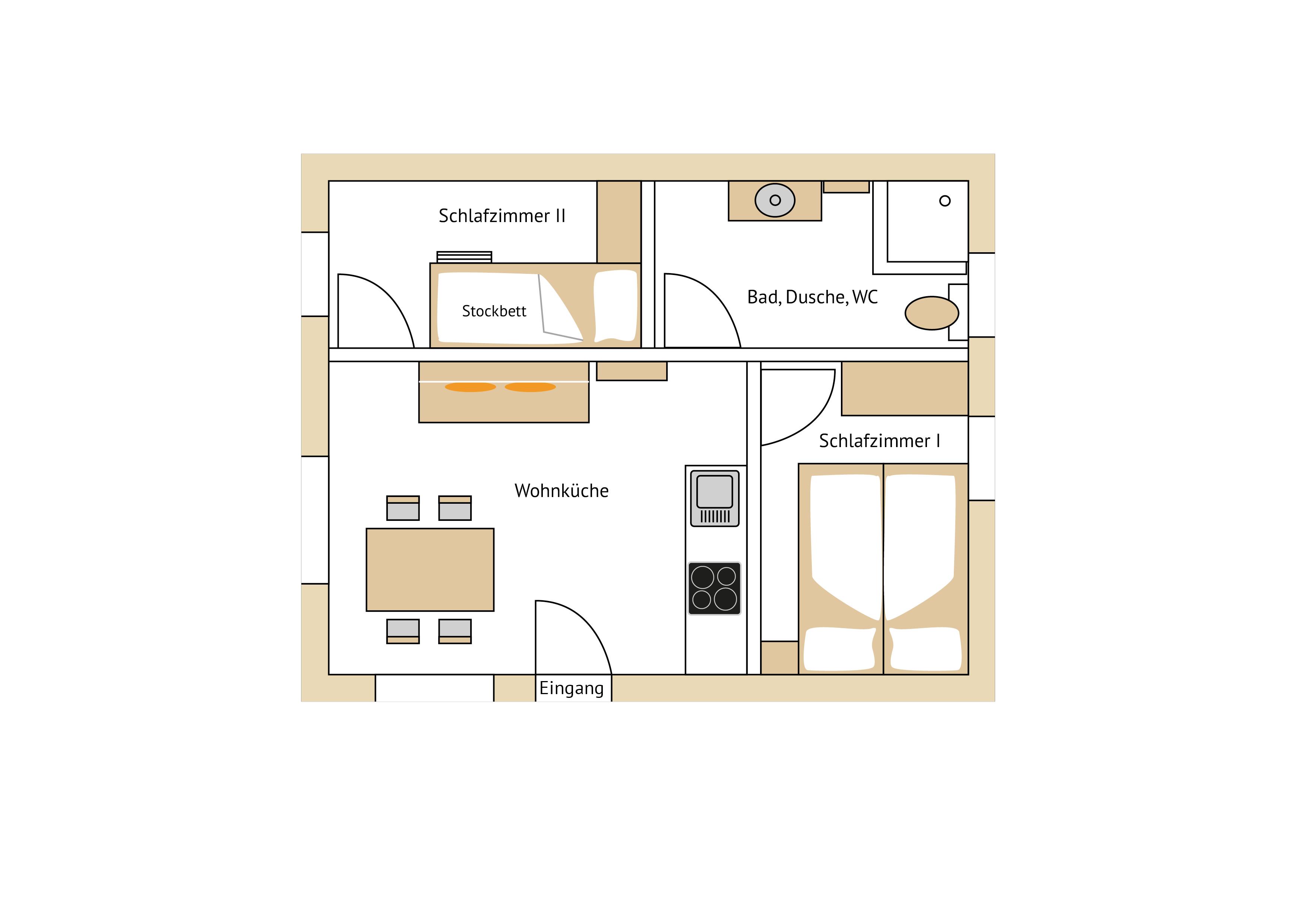 2 Schlafzimmer (1 Doppelbett und 1 Stockbett)