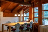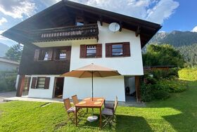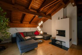 Die 3-Zimmer-Ferienwohnung im DG ist ca. 85 qm groß. Der große/offene Wohn-Essraum mit Küche ist geprägt von großen Fenstern, die nach Süden ausgerichtet sind und den Blick direkt auf den Sonnenkopf freigeben. Die hohen Dachschrägen verleihen dem Raum einen großzügigen, hellen Charakter. Der große Eichenholztisch, sowie das gemütliche Loungesofa sorgen für ein sehr heimeliges Ambiente. Vom Wohn-Essbereich betritt man den südseitigen Balkon, der zum Frühstücken/Grillen einlädt–Gasgrill und Balkontisch mit Stühlen sind vorhanden. Die Küche ist mit bestens ausgestattet. Zur Wohnung gehören zwei Schlafzimmer, beide mit Vollholz-Doppelbetten. Neben einem Bad mit Dusche und WC, gibt es noch ein separates WC. Highlight der Wohnung sind der offene Kamin im Wohn-Essraum und die Dampfdusche im Bad. Den Gästen stehen eine Sauna (Schuppen im Garten, gegen extra Gebühr) sowie Ski- und Fahrradkeller mit Skischuhheizung zur Verfügung. Jede Wohnung besitzt einen Stellplatz im Hof.