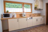 • In der voll ausgestatteten, modernen Küche befindet sich: Kochfeld, Geschirrspüler, Kühlschrank mit Gefrierfach, Kaffeemaschine, Mikrowelle, Wasserkocher, Geschirrtücher und selbstverständlich ausreichend Geschirr, Pfannen und Töpfe.