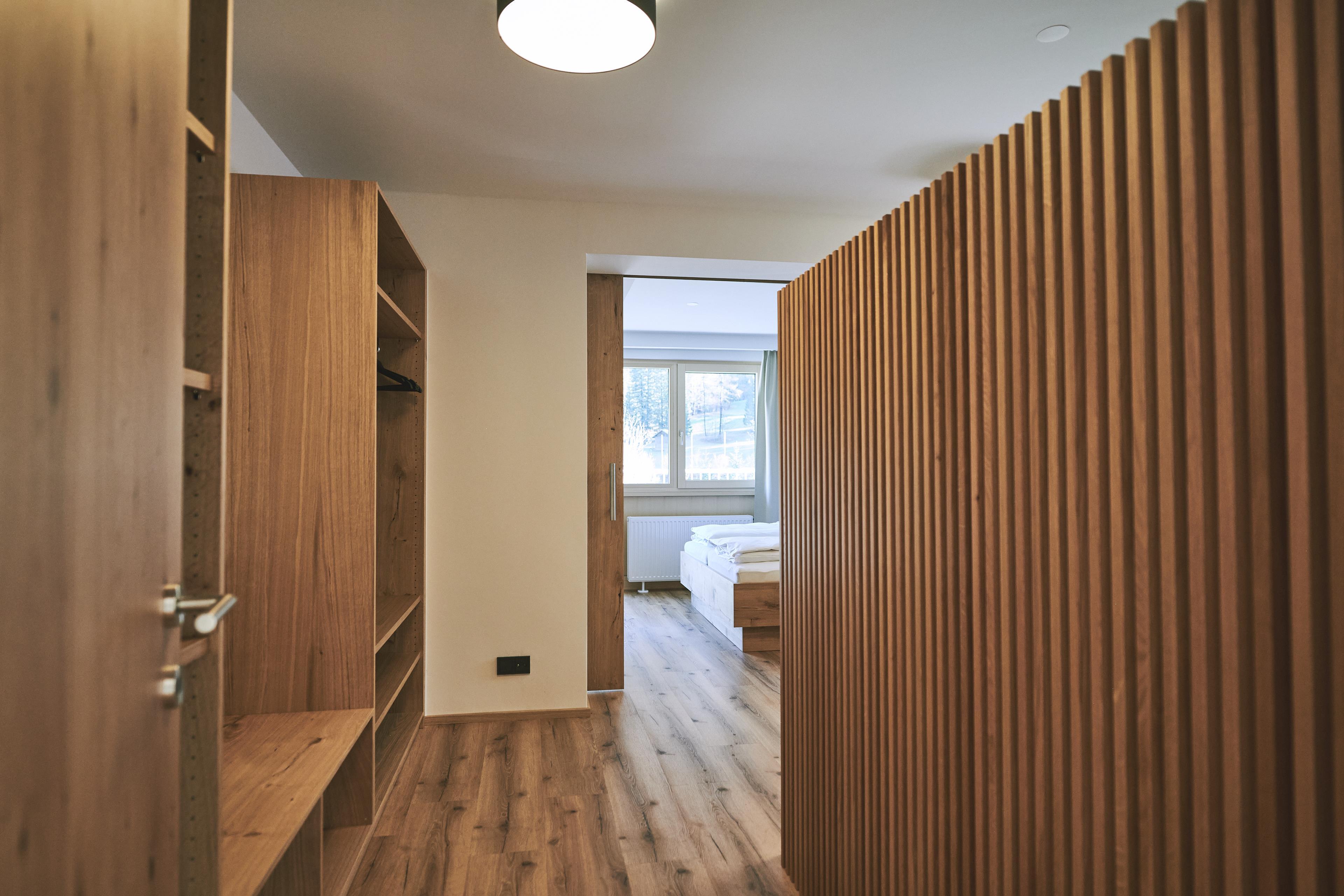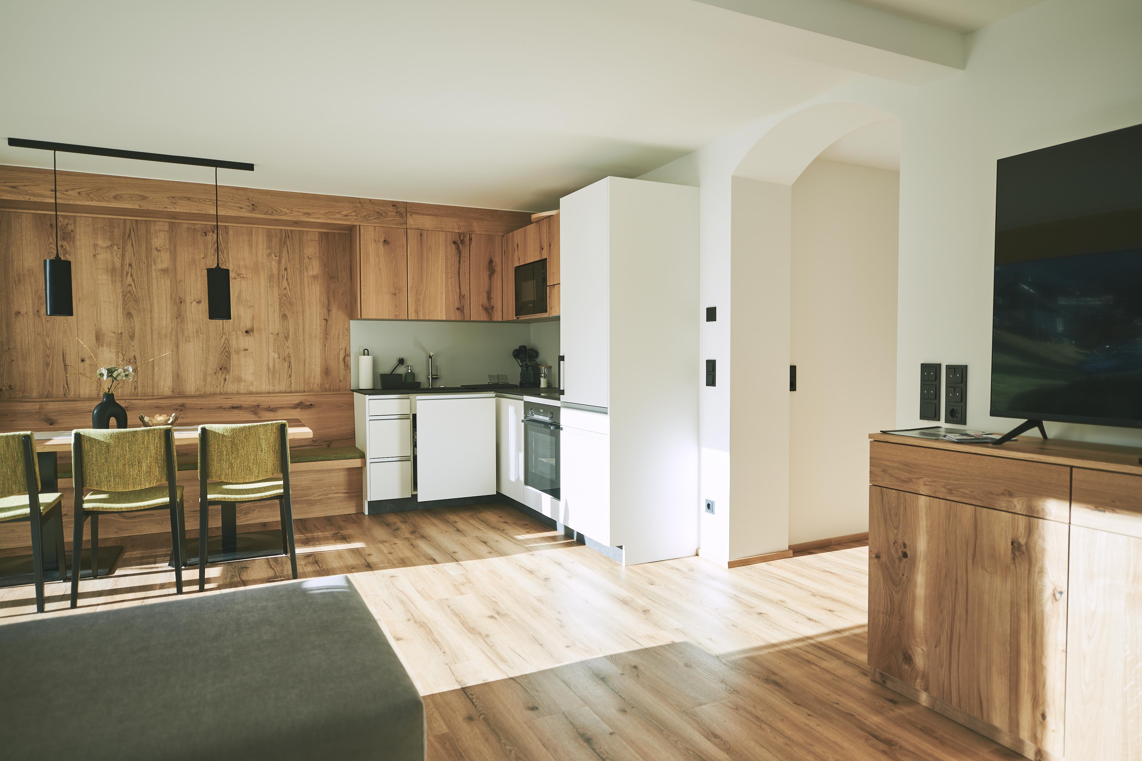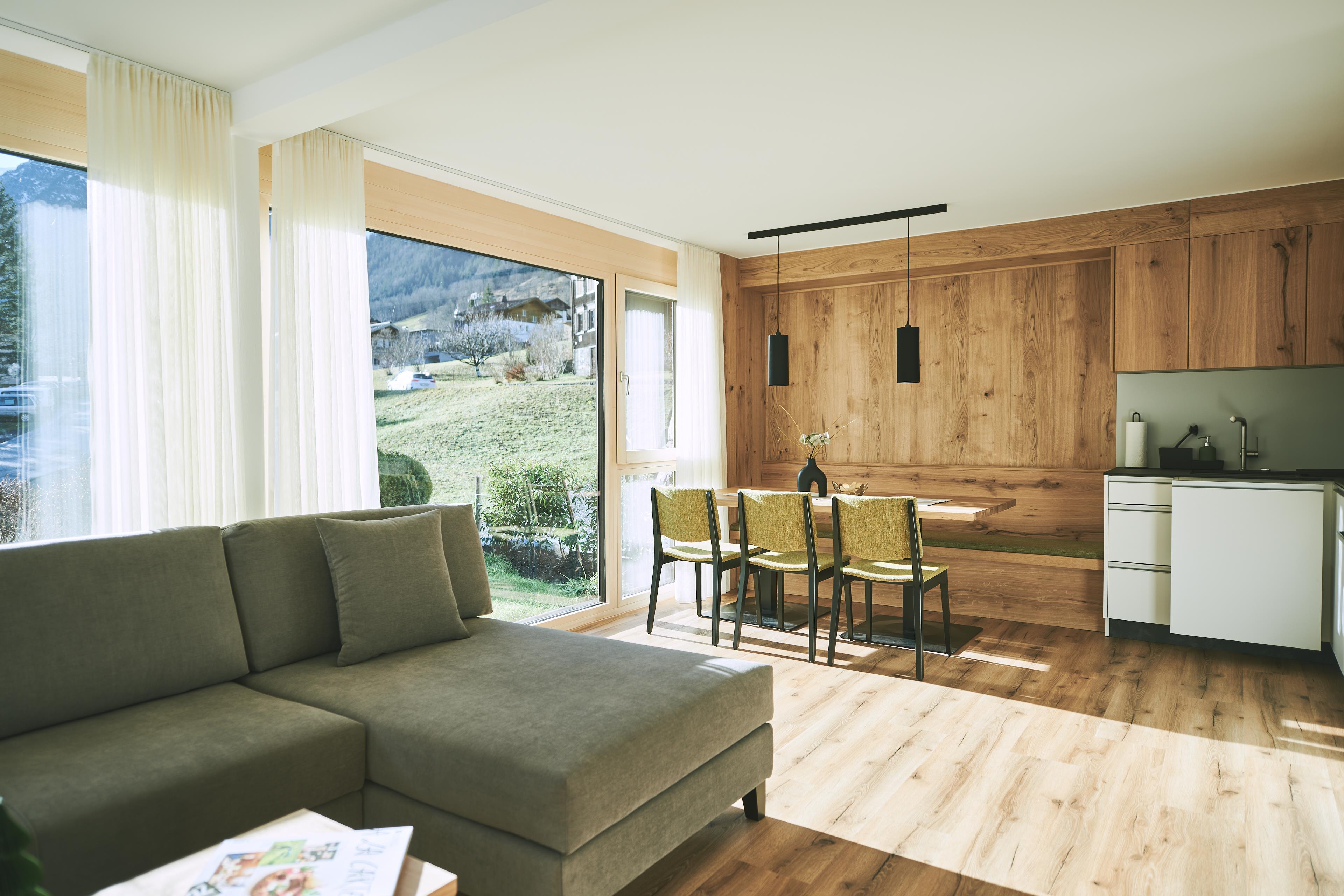 Mit 70 Quadratmeter bietet unser Familienappartement Mottakopf großzügig Platz für zwei bis fünf Personen. Im Wohn-Essbereich samt großen Esstisch, südseitiger Terrasse mit Panorama Bergblick, 1 Doppelzimmer mit Verbindungsschiebetür zum 2. Schlafzimmer mit 3 Betten, Badezimmer mit Dusche und WC sowie einem separaten WC gibt es genügend Platz für alle. In der vollausgestatteten Küche befinden sich Geschirrspüler, Induktionskochfeld, Backofen und Kapsel-sowie Filterkaffeemaschine. Heimeliges Wohngefühl und viel Holz gibt es von uns gerne obendrauf!
