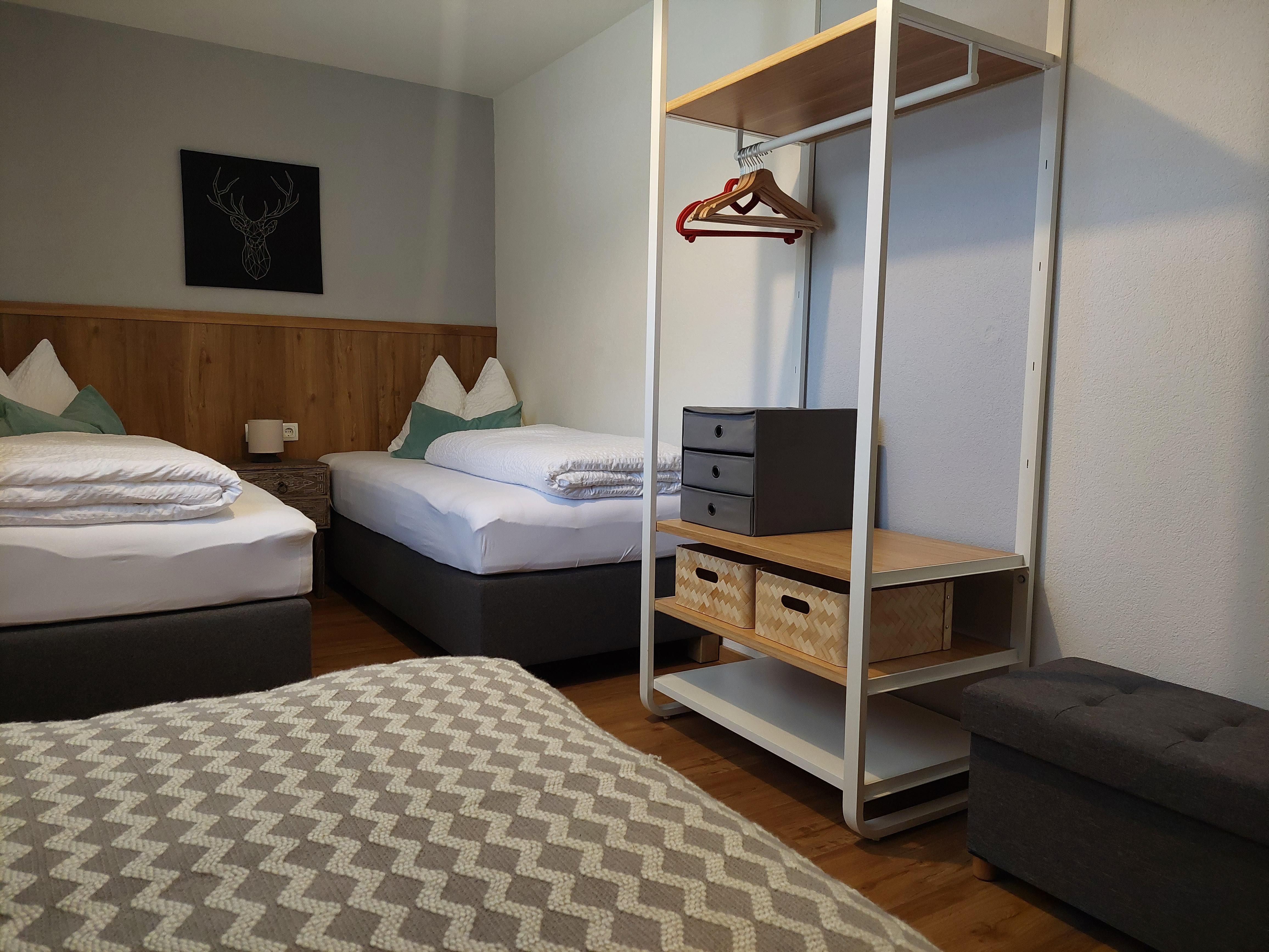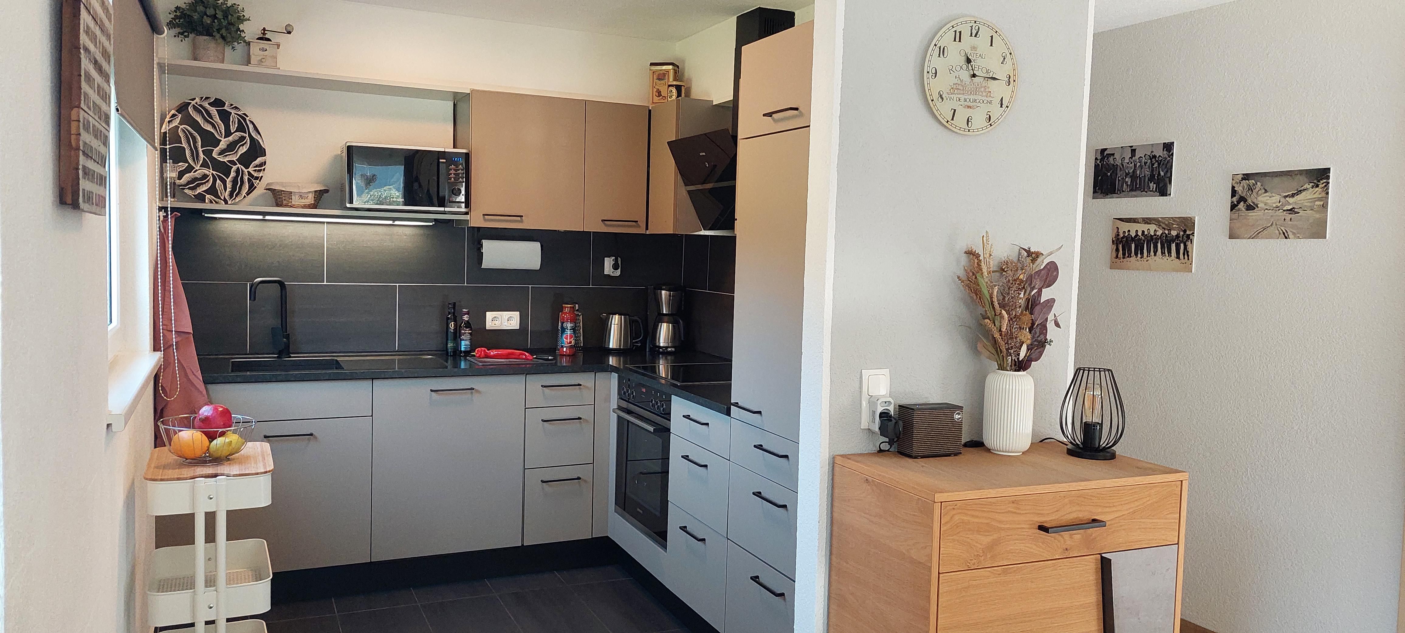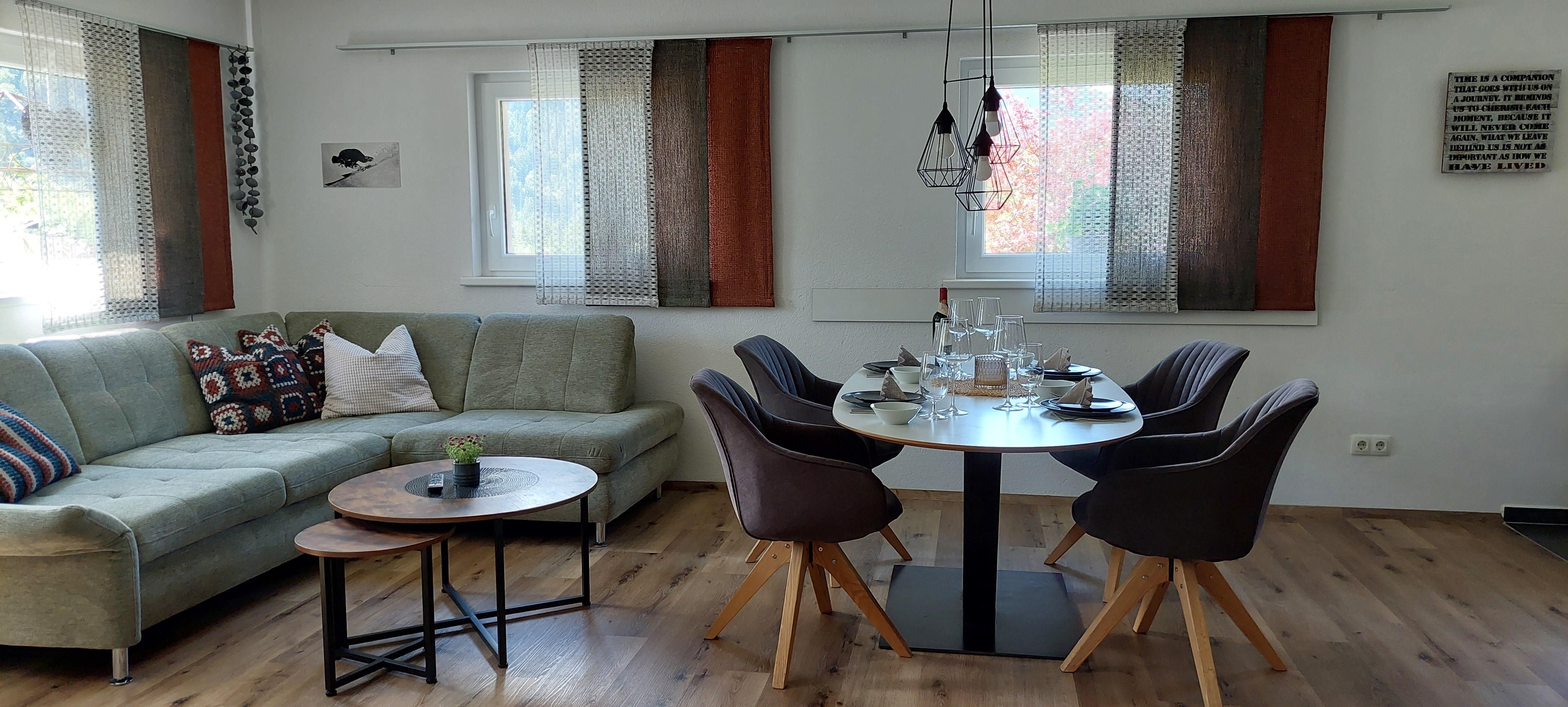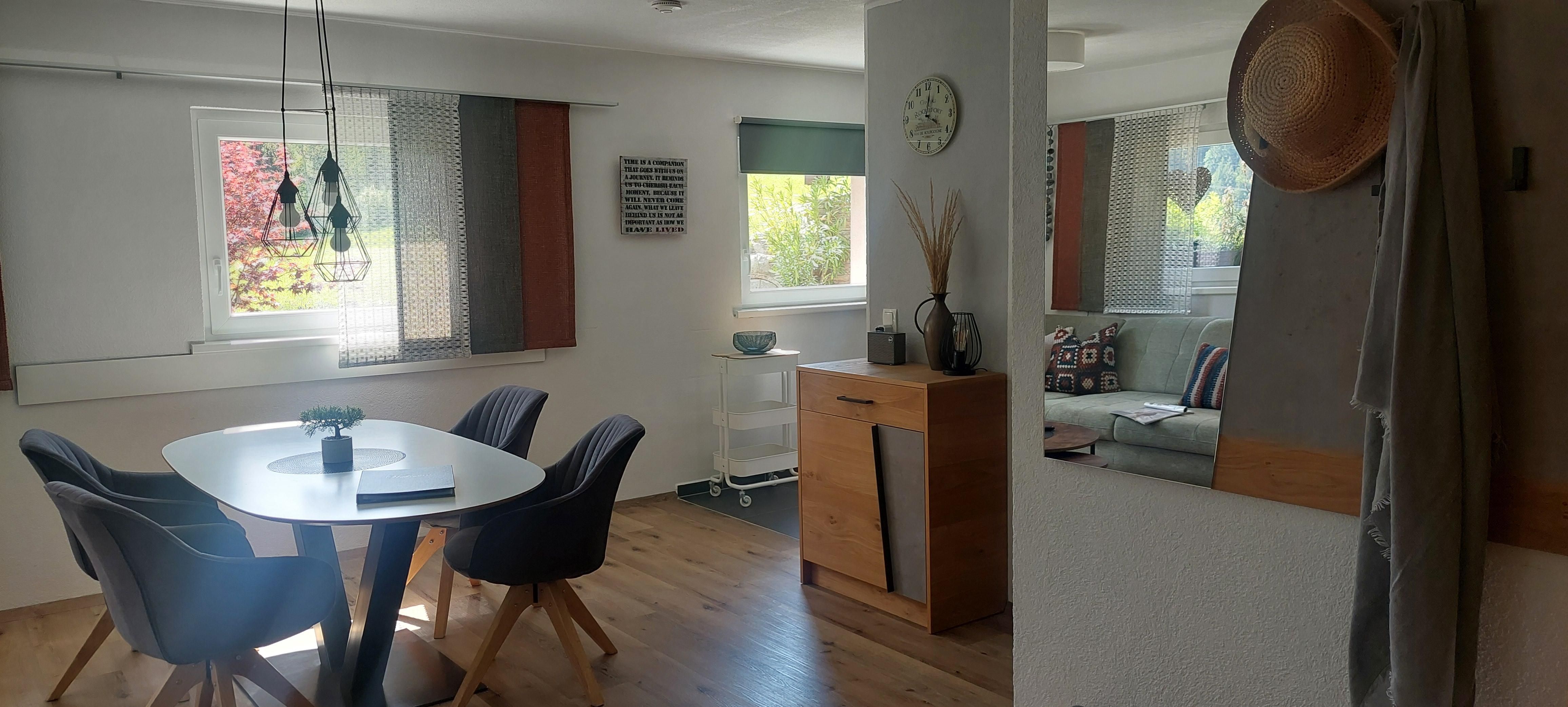 Unsere ebenerdige Ferienwohnung ist 73 m² groß mit eigenem Eingang. Sie besteht aus einem Doppel- und einem Dreibettzimmer mit 3 getrennten Boxspringbetten, großzügiger Wohnküche mit Essbereich und gemütlicher Couch, sowie Dusche/Waschbecken plus separates WC. Das Badezimmer und das WC haben wir im Frühjahr 2023 neu renoviert und dekoriert. Die Küche ist neu gestaltet und voll ausgestattet mit Mikrowelle, Geschirrspüler, Backofen, Ceran Kochfeld, Kühlschrank mit Gefrierfach, Toaster, Wasserkocher, Filterkaffeemaschine, SAT TV, WLAN, Radio, Haarfön. Qualitativ hochwertige Boxspringbetten aus Italien in allen Zimmern sorgen für einen erholsamen Schlaf in den Bergen.