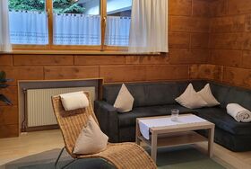 • Gästeküche und gemütlicher Aufenthaltsraum mit Kachelofen und Heimkino