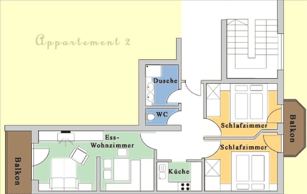 Modern ausgestattetes Appartement mit eigener Küche, Mikrowelle , Geschirrspüler, Wasserkocher und Toaster. Wohnraum mit Schlafcouch, 2 getrennte Schlafzimmer, WC extra, 1x Dusche mit Doppelwaschbecken, Fön, Safe, Kabel-TV,W- Lan, Radio, Telefon und Balkon. Größe: ca. 65 m².