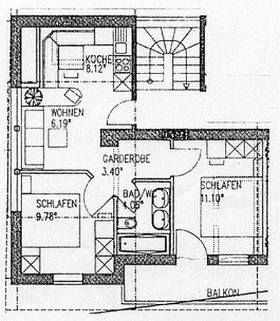 Appartement im 2. Stock mit 2 Doppelzimmer, Dusche/WC, vollausgestattete Wohnküche (E-Herd, Backofen, Kühlschrank, Kaffeemaschine, Spülmaschine...) mit Sofa , Kabel-TV, Telefon, Balkon. Größe: ca. 43 m².