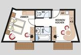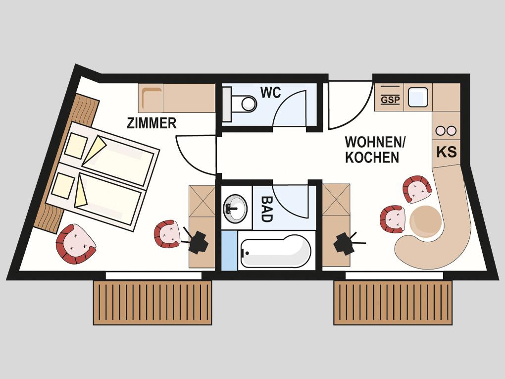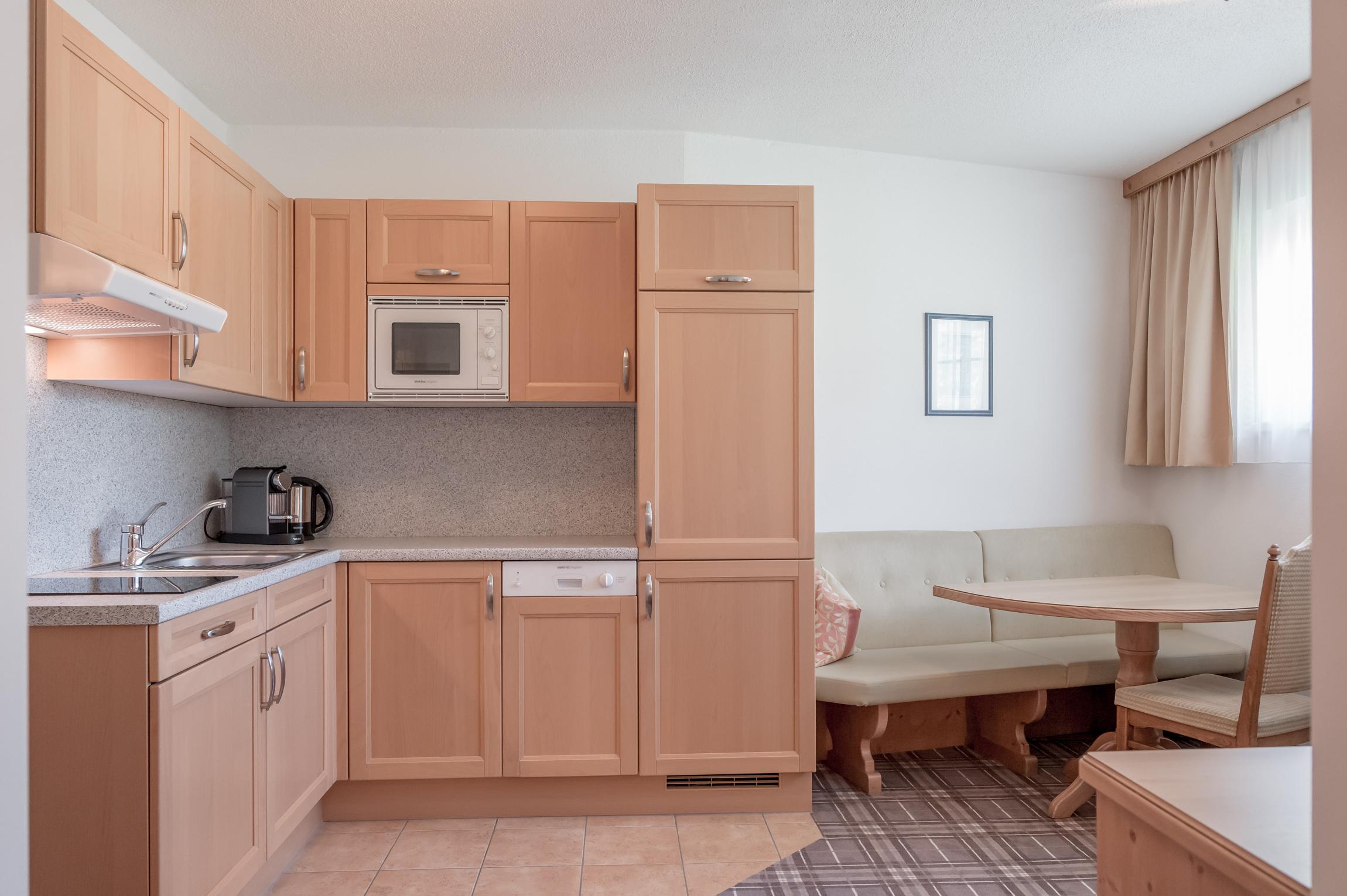 Appartement Pillersee (ca. 35 m²): 1 Doppelzimmer, 1 Badezimmer mit Badewanne, separates WC, 1 Wohnküche mit Essplatz, 2-Platten-Herd, Mikrowelle, Geschirrspüler, Kabel -TV, Nordseite.